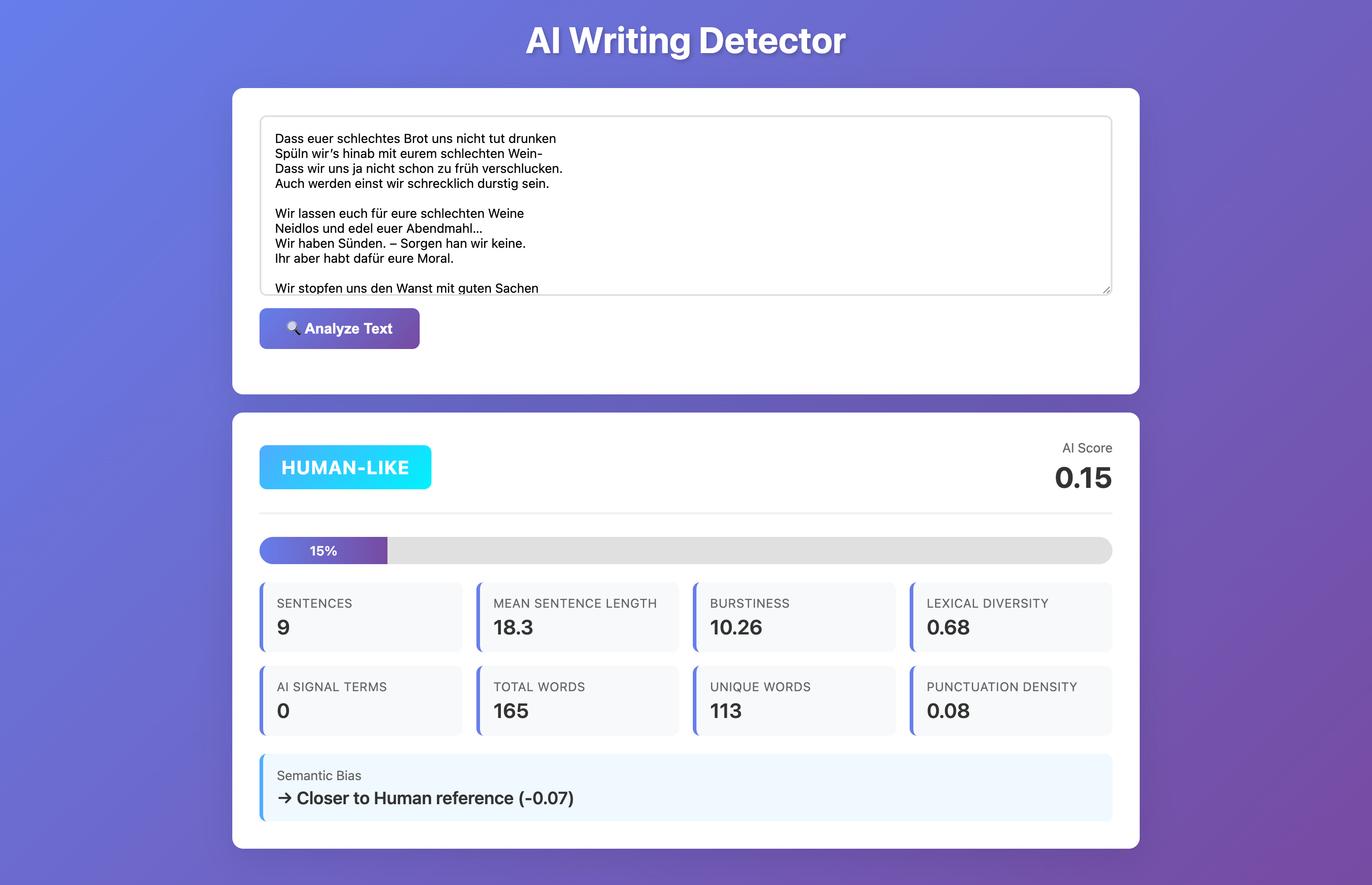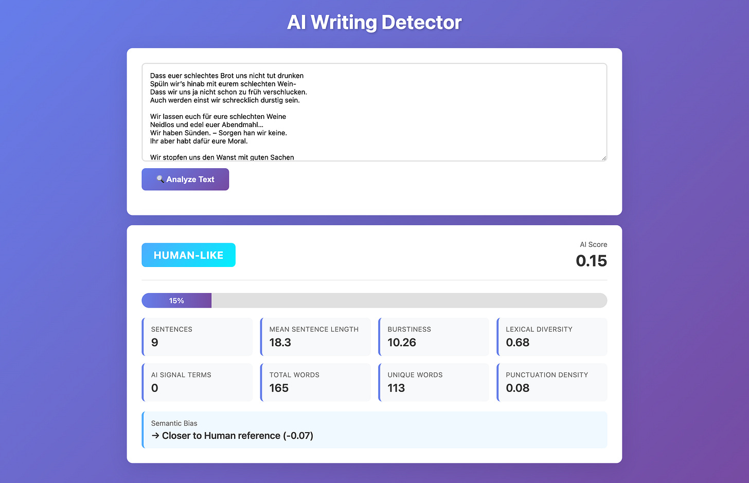 If you use example text from Bert Brecht (clearly human) you will get a human like response. If you copy the first paragraph of this text, the Semantic bias is closer to AI while the static analysis does still say it is “human-like”.