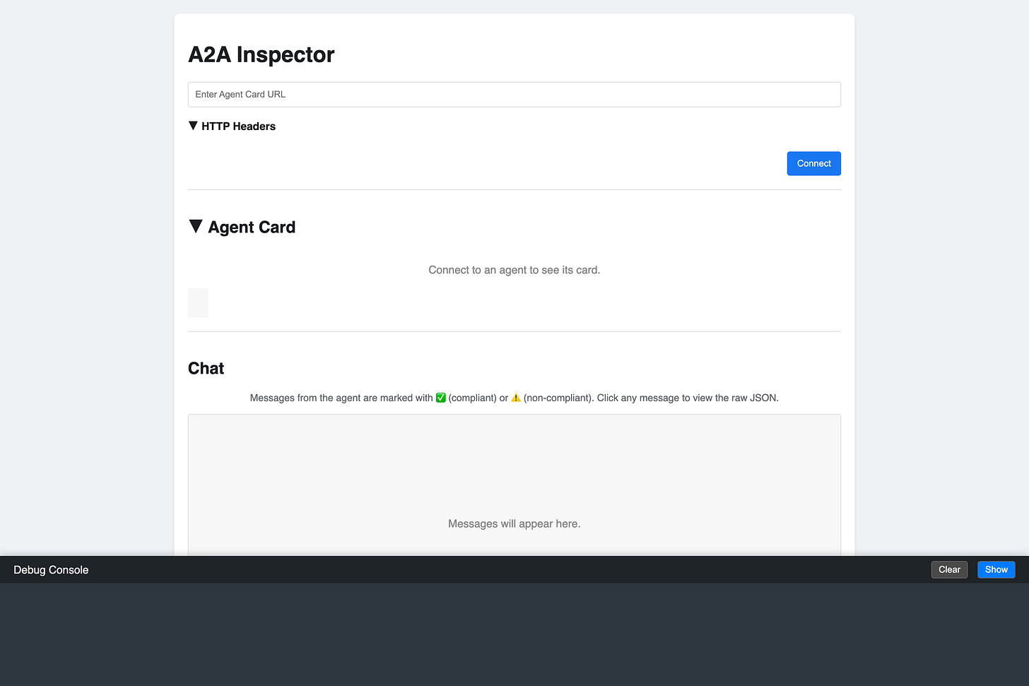 podman run -d -p 8081:8080 a2a-inspectorNote that I have changed the external port hier because we are going to run our Agent on port 8080 already. Check if the inspector is running by going to: http://localhost:8081/. You should see something like this: