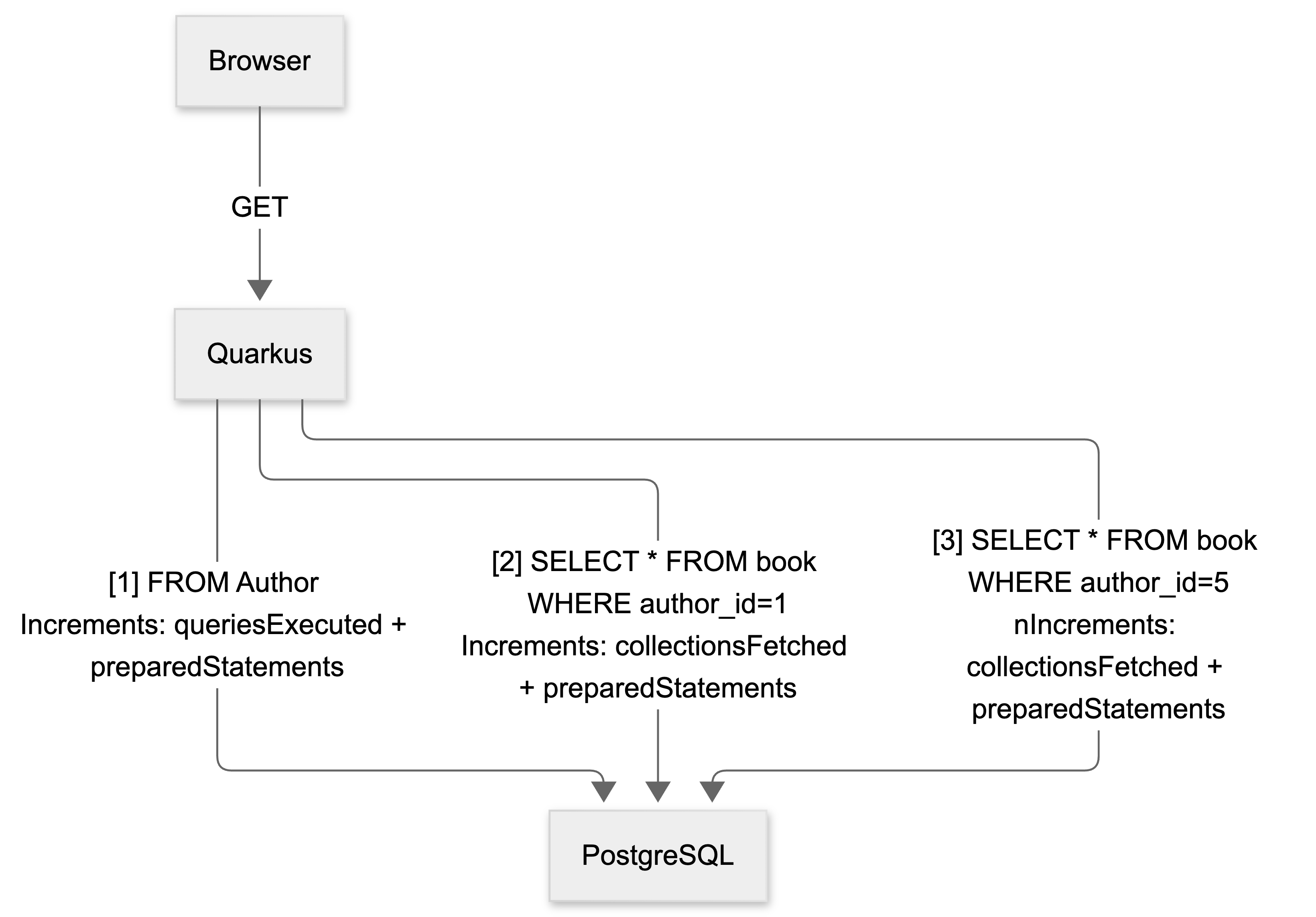 A BookstoreResource REST endpoint backed by two JPA entities, Author and Book, with a deliberate N+1 query problem baked in. We will use statistics to surface the problem, fix it, and prove the fix worked using an assertion-level test.