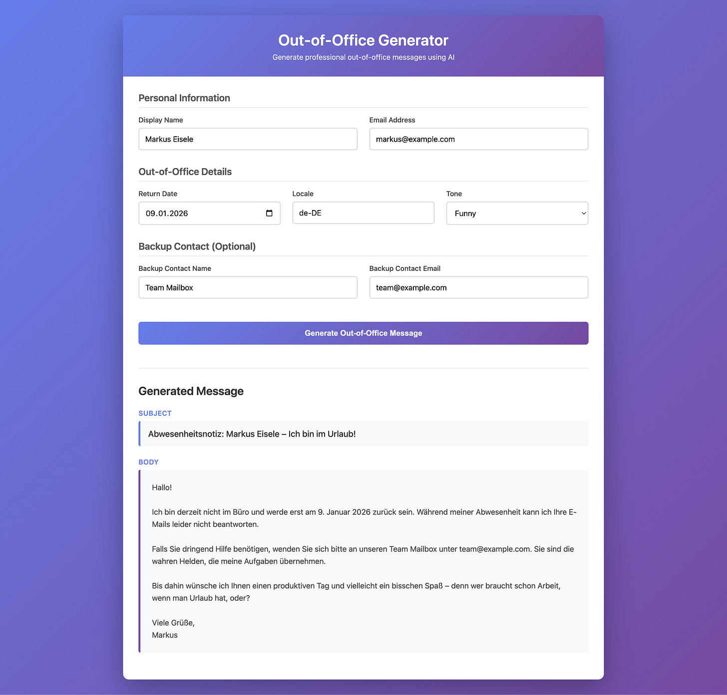 You now have a small Quarkus service that generates out-of-office replies using LangChain4j and a local Ollama model (gpt-oss:20b), plus a tiny Qute page for quick testing. It’s simple, fast to demo, and realistic enough to reuse later.