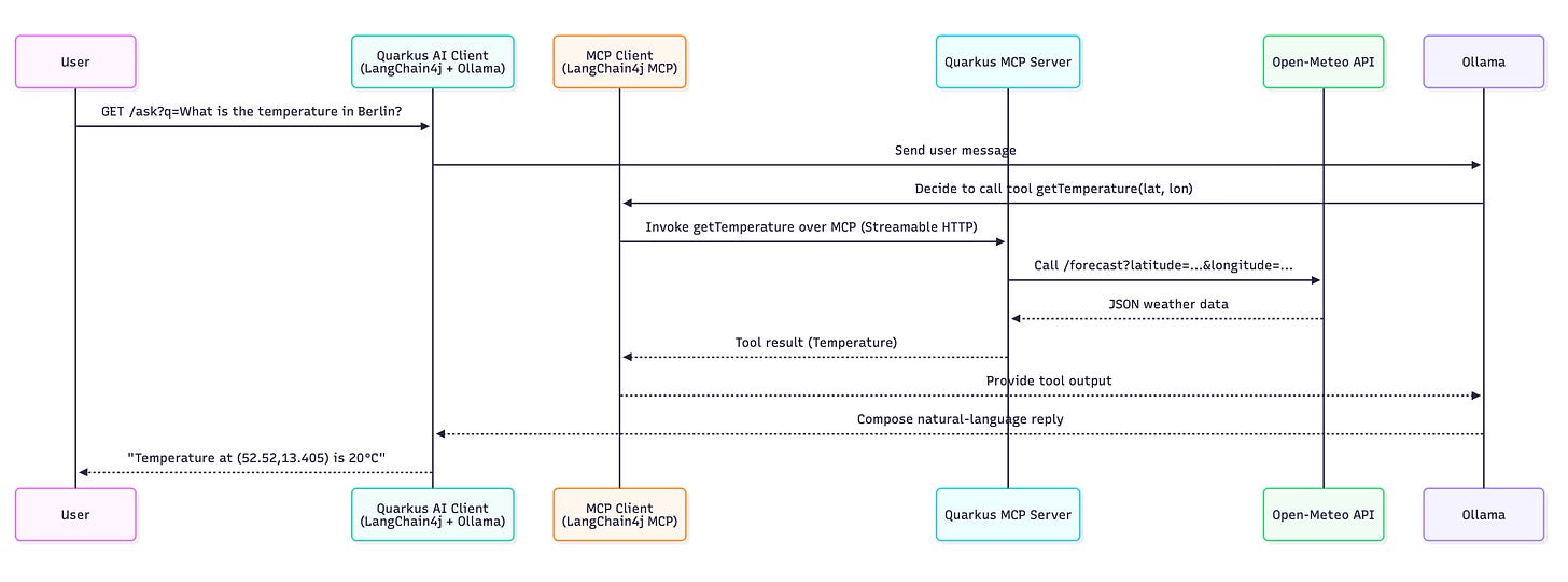 Before we dive into code, let’s visualize the flow. The diagram below shows how the components interact when you ask the client about the temperature in Berlin: