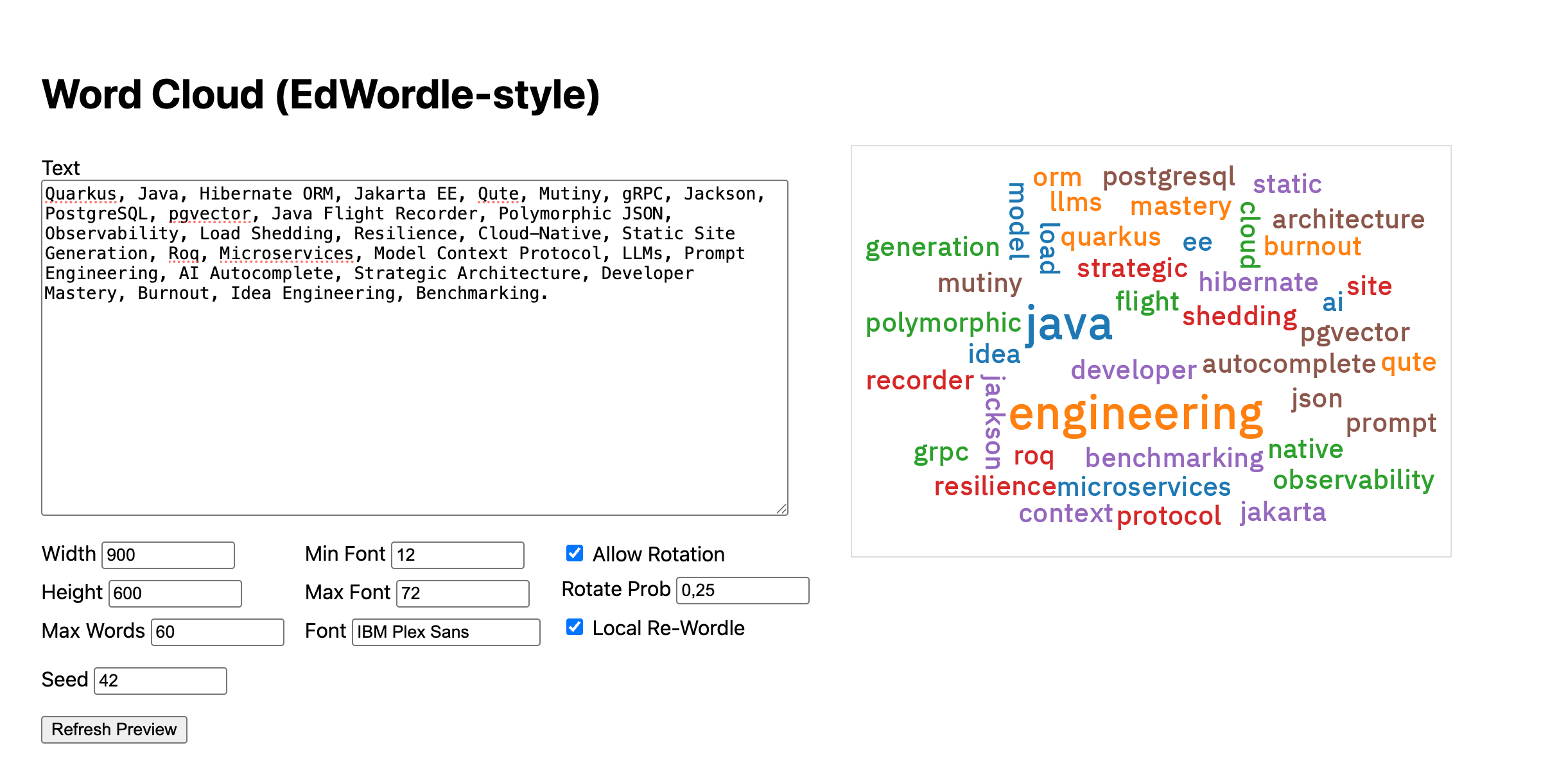 A hands-on guide to building a Wordle/EdWordle-inspired renderer in pure Java, running inside Quarkus, streaming PNGs over REST, and exposing a small Qute UI so you can tweak parameters and watch the layout evolve.