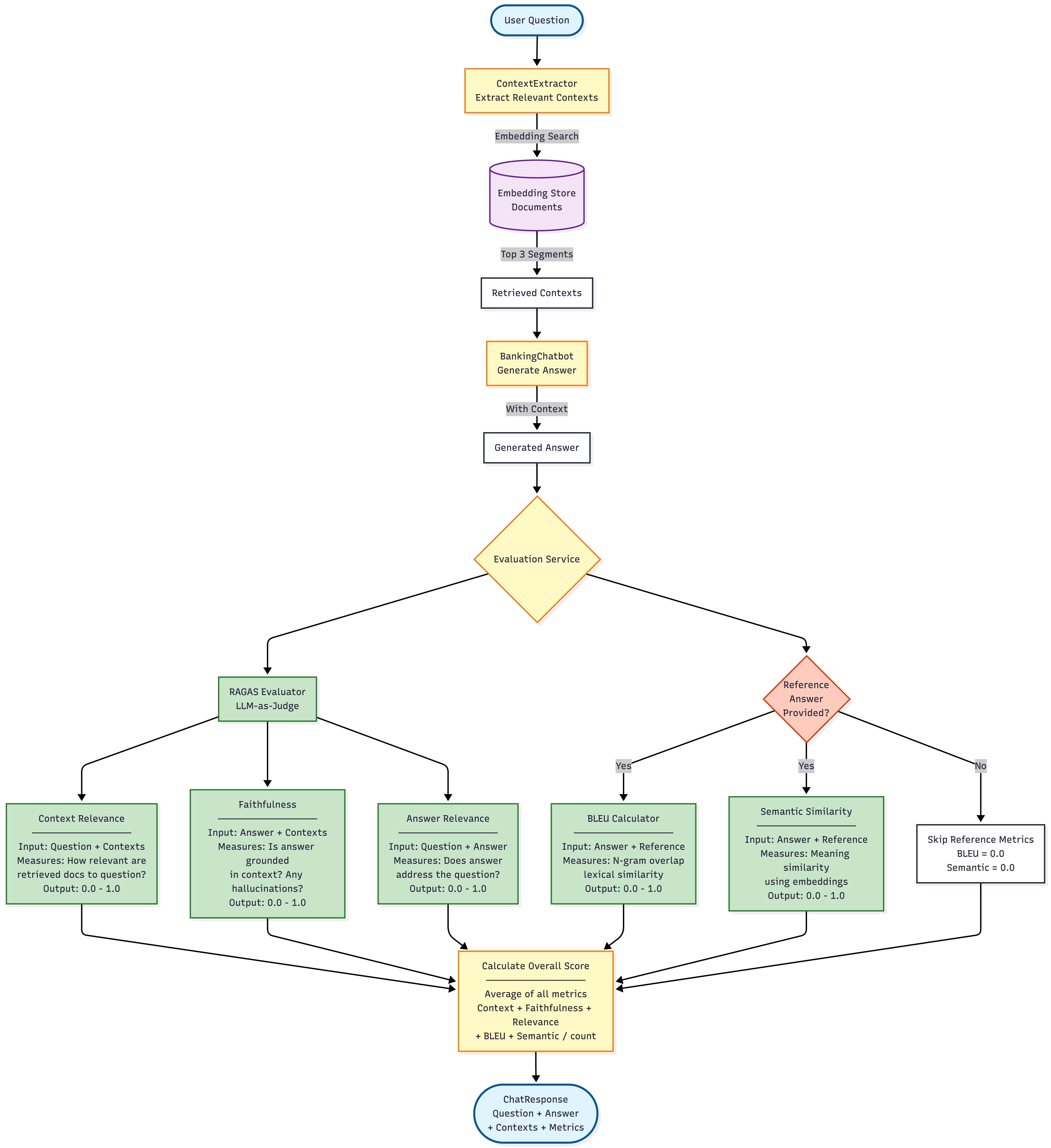 Evaluation Pipeline with RAGAS, BLEU, and Semantic Similarity metrics