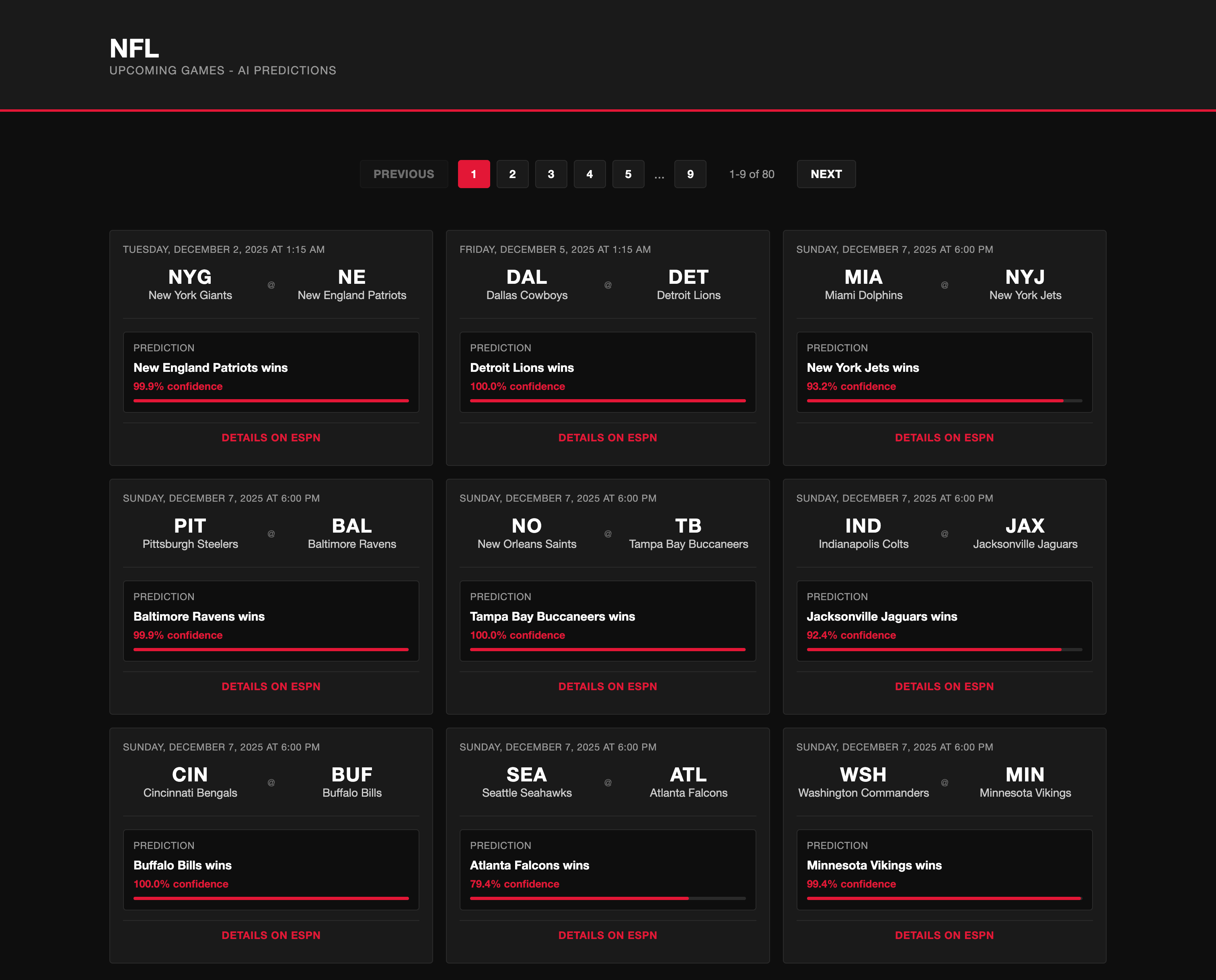 The Qute UI provides a polished, NFL-themed web interface for viewing game predictions.