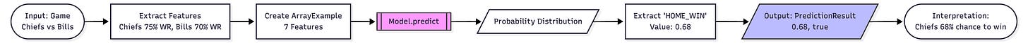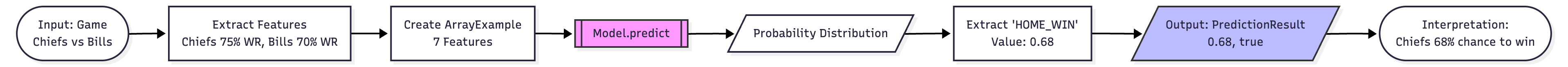 The ModelInference is responsible for using the trained ML model to make predictions on upcoming games. It takes a game (with two teams) and predicts which team will win, along with the probability of that outcome.