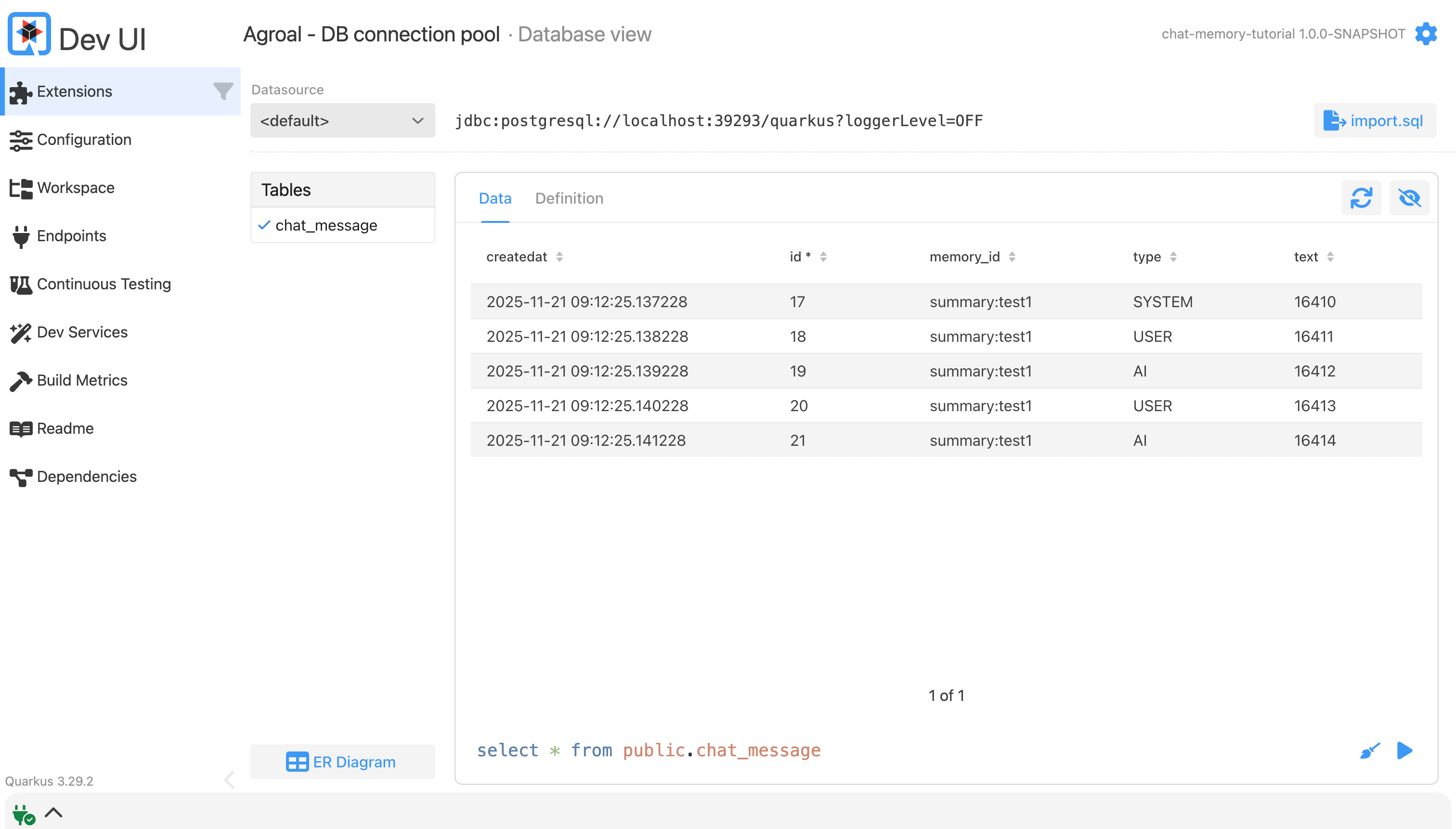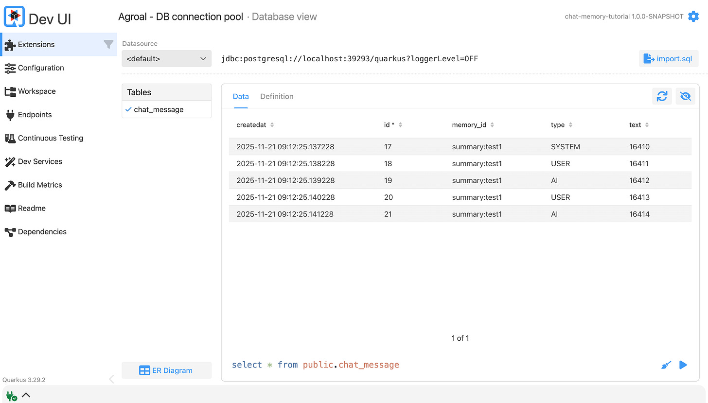 %dev.quarkus.datasource.dev-ui.allow-sql=trueThe chat-memory.max-messages property controls the sliding window size—how many recent messages to send to the LLM.