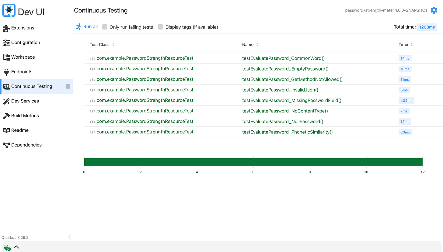 You’ve just built a phonetic password strength meter with Quarkus. A system that goes beyond entropy and detects how sayable a password is.
