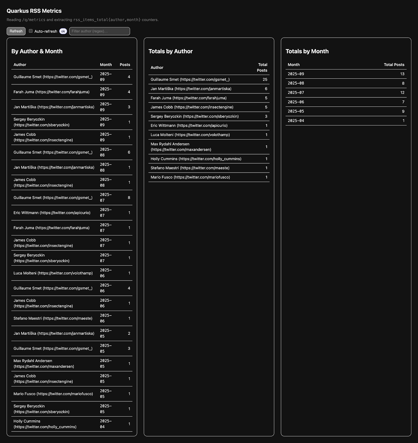 rss_items_total{author=”Guillaume Smet (https://twitter.com/gsmet_)”,camelContext=”camel-1”,month=”2025-09”} 32.0