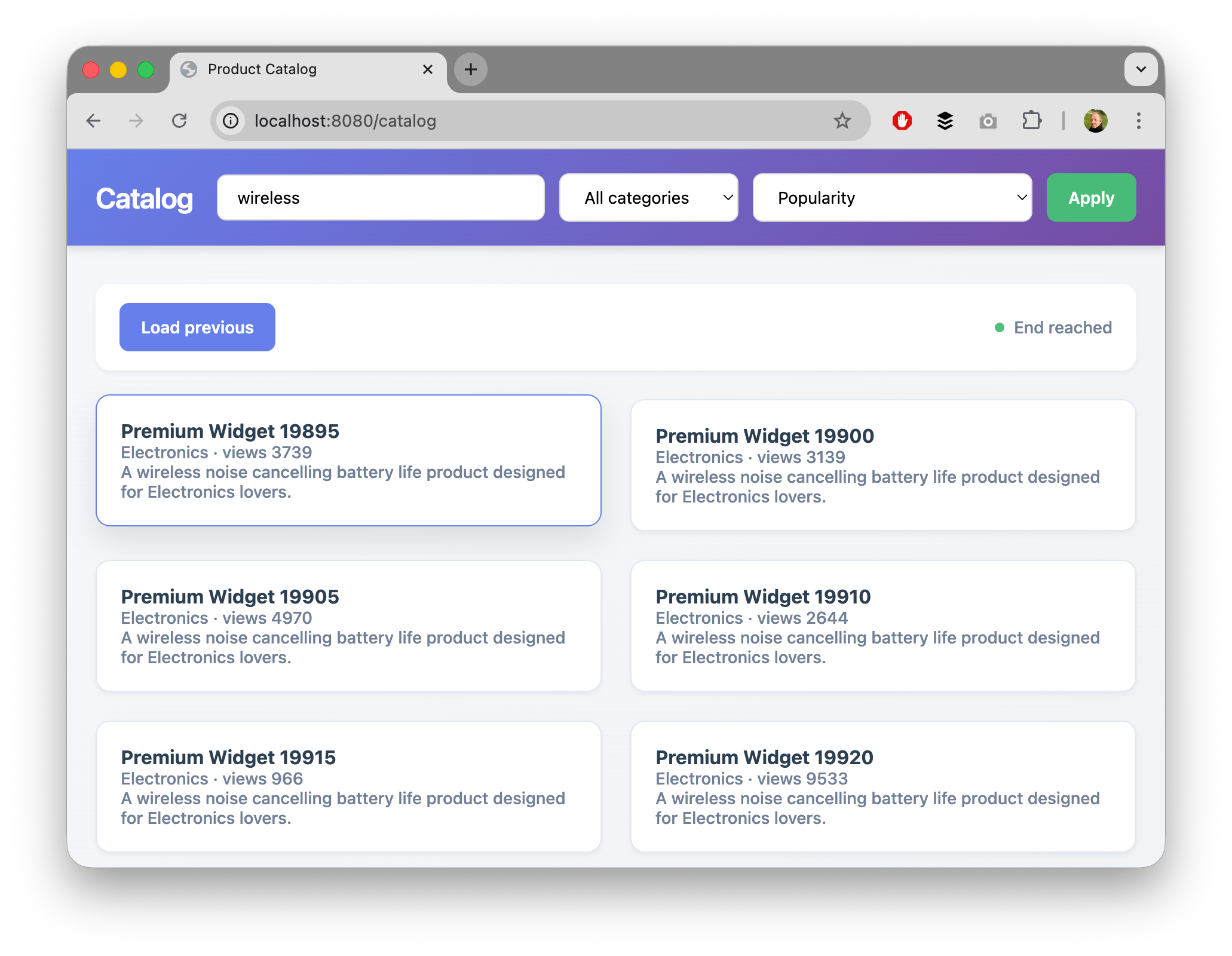 open http://localhost:8080/catalogExpected behavior: products render, scrolling loads more automatically, and the “Load previous” button becomes enabled after at least one forward page.