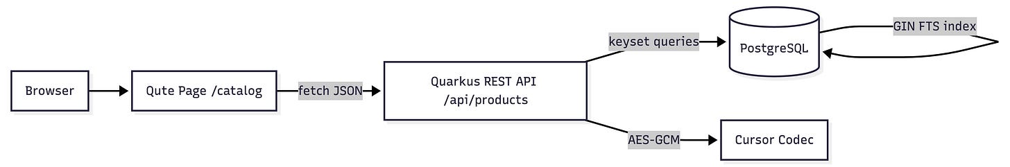 We took the original infinite scroll catalog and pushed it into the territory where real systems start to wobble: search relevance, back pagination, and client behavior you don’t control. The database still seeks, the cursors are now capabilities instead of hints, and the UI is simple enough to ship as one Quarkus service.