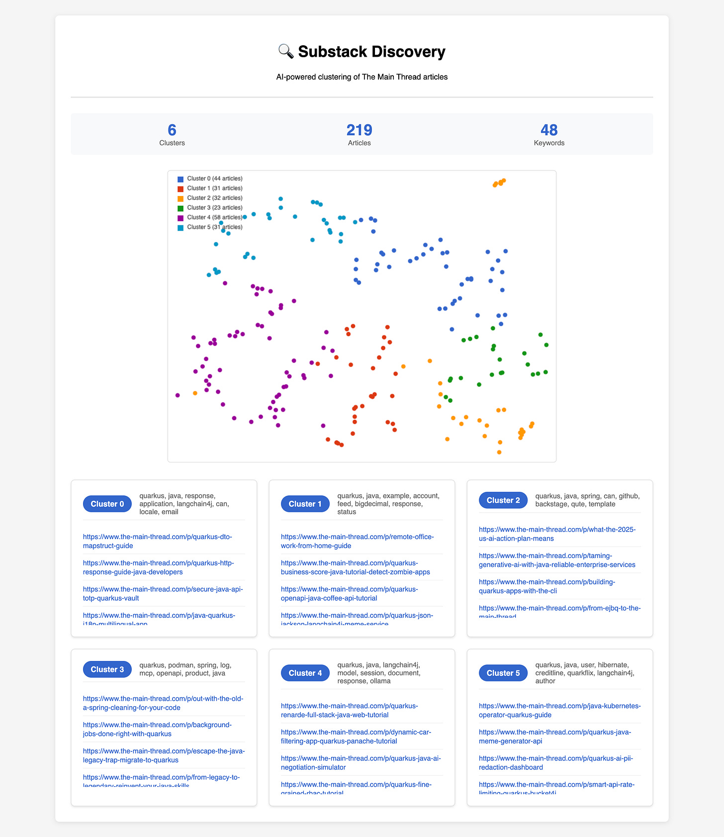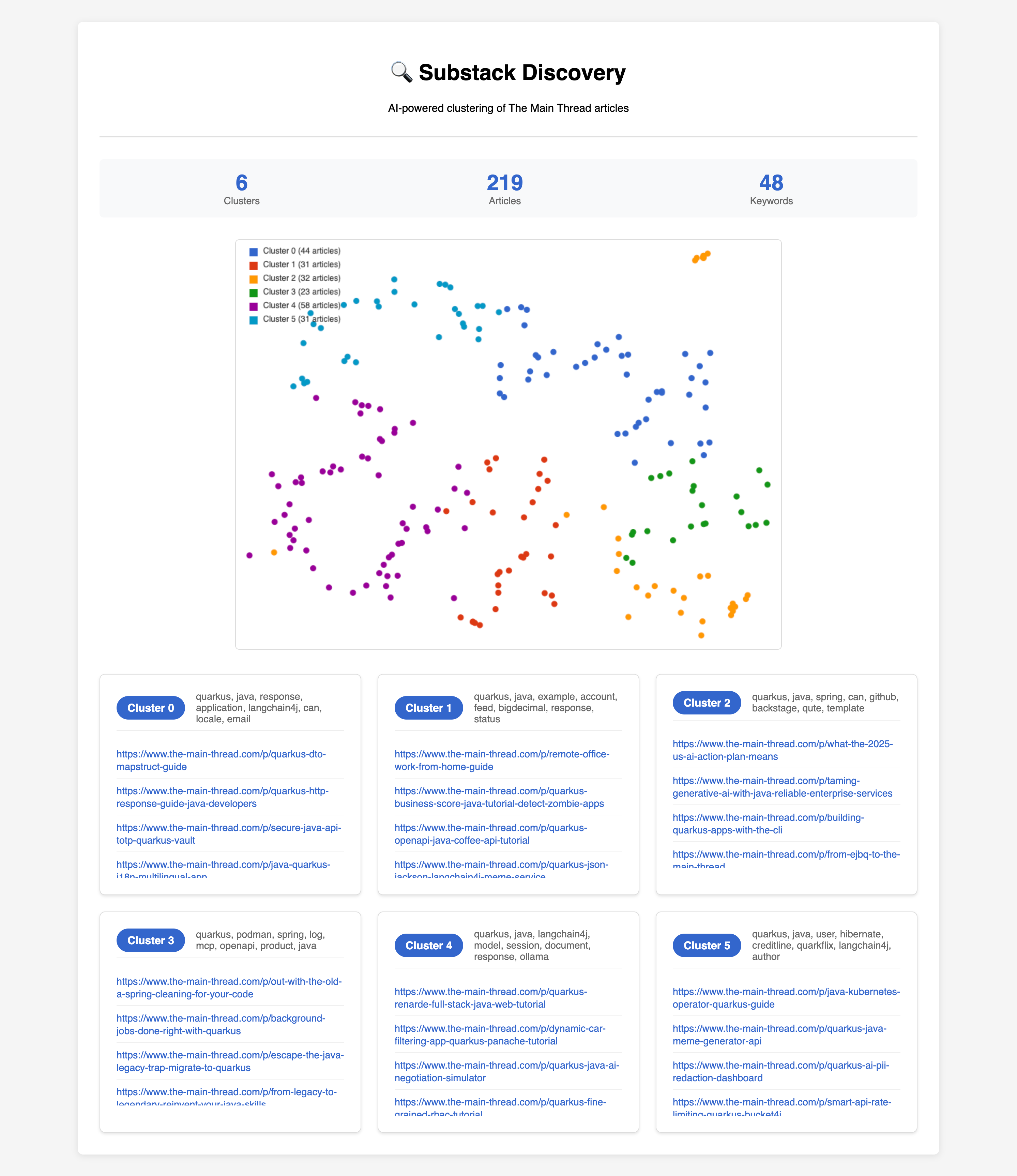 With less than 300 lines of Java code, we built a system that scrapes, analyzes, clusters, labels, and visualizes your entire Substack archive. No manual tagging needed. You now have a map of your content that evolves with you.