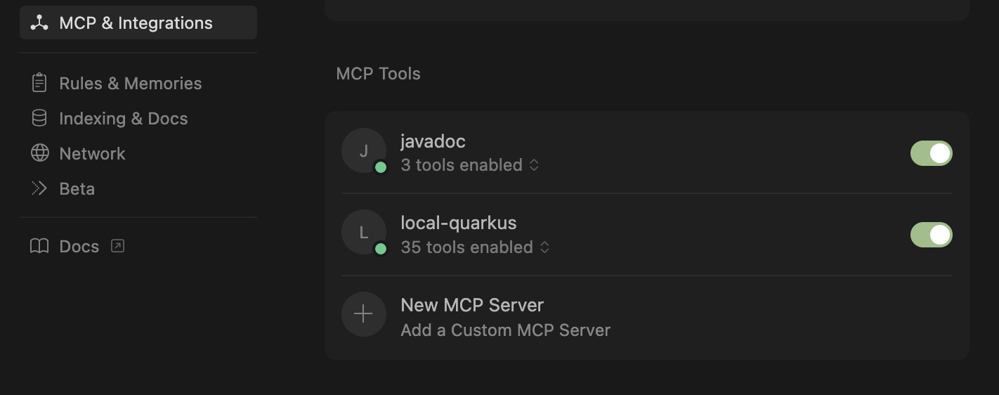 The Model Context Protocol (MCP) is emerging as the standard way to connect tools to AI assistants. With Quarkus you can now expose your development tools directly as an MCP server through the Quarkus Dev UI. This opens the door to integrating your Quarkus applications with editors like Cursor or IDE extensions without extra glue code.