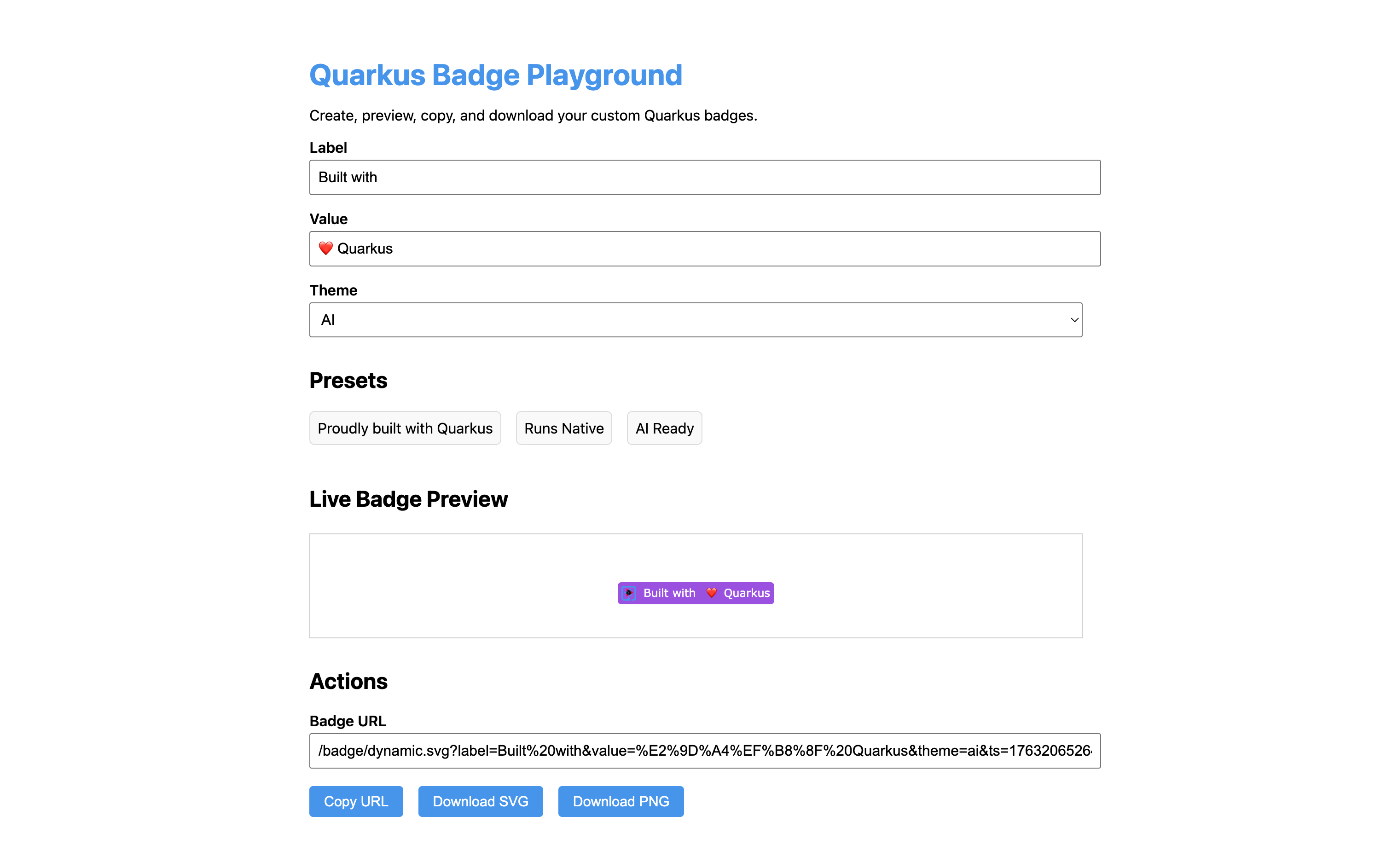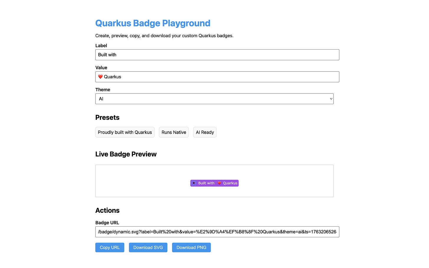 <p>Create, preview, copy, and download your custom Quarkus badges.</p>
