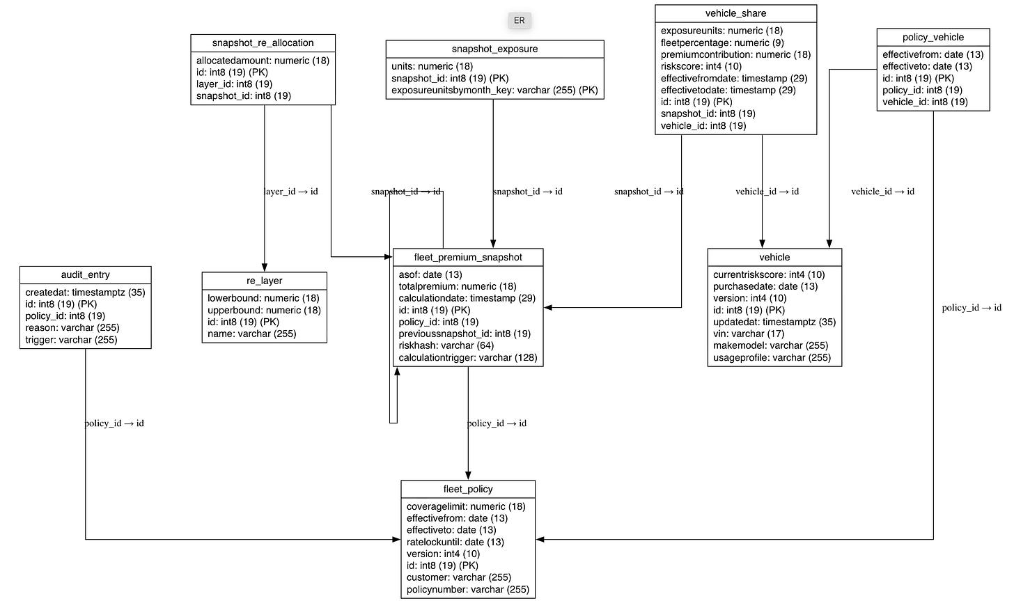 FleetPremiumSnapshotcaptures a point-in-time result. It ownsVehicleSharerows and reinsurance allocations for that moment.Optimistic locking: