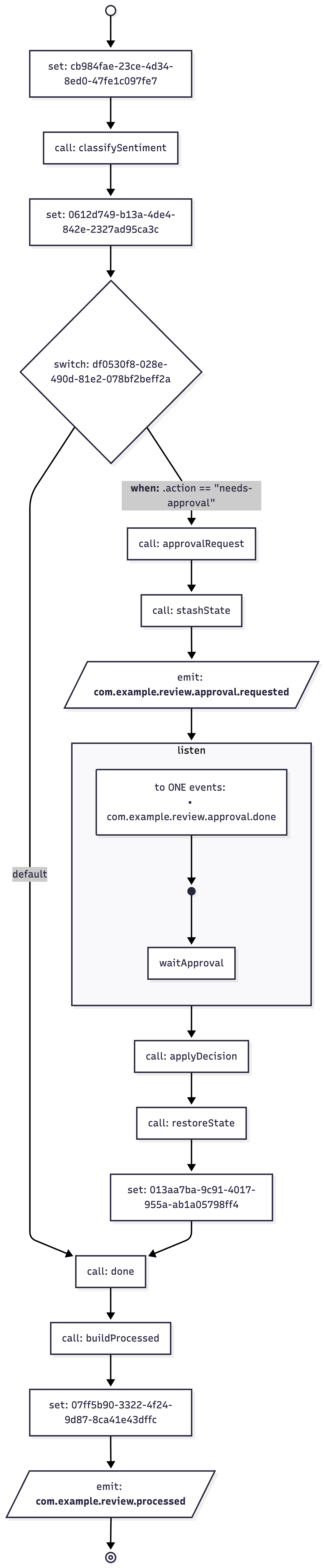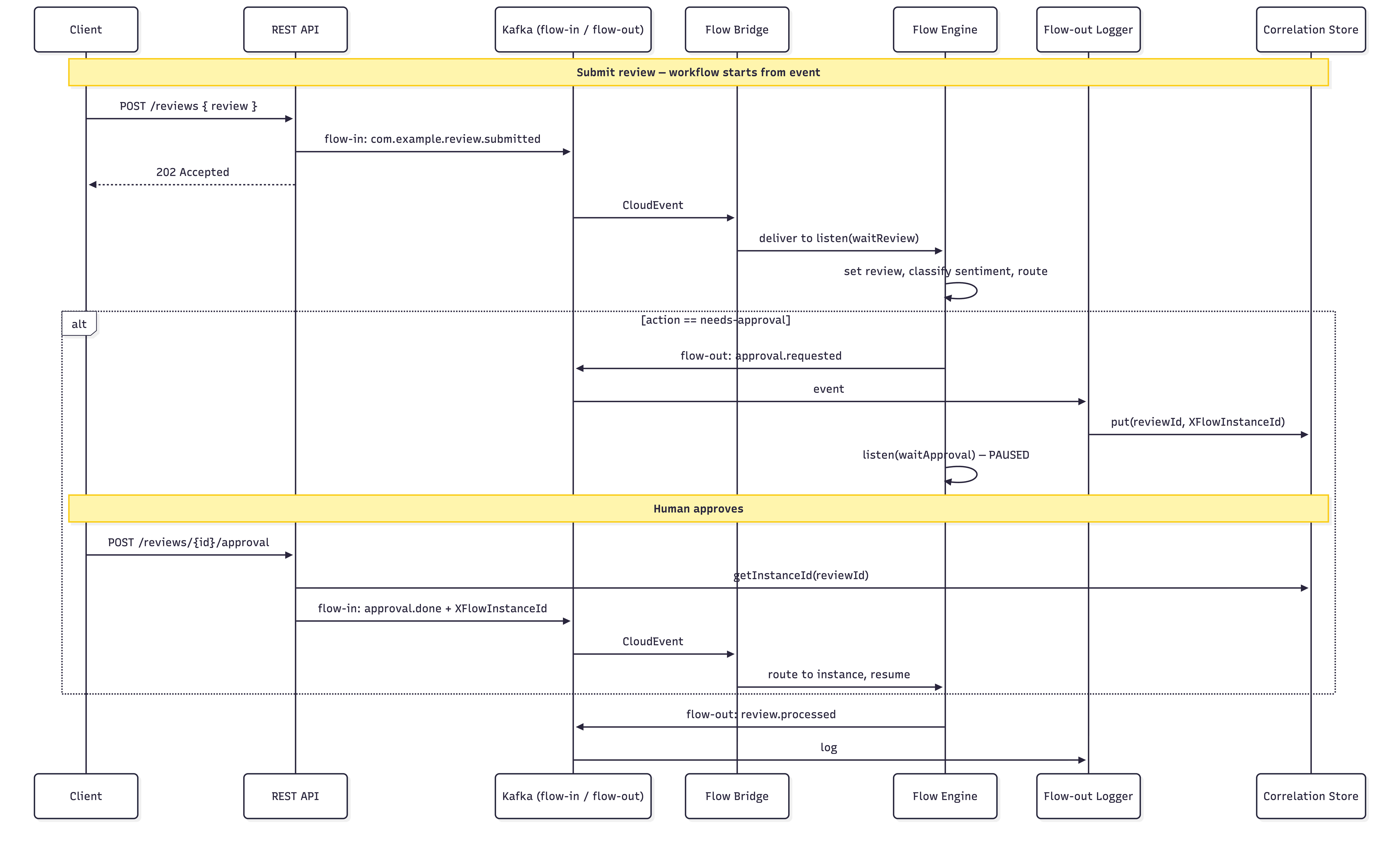 The workflow is event-driven. It starts when a com.example.review.submitted CloudEvent arrives on the flow-in topic. The Flow bridge delivers it to the engine, and the workflow processes it.