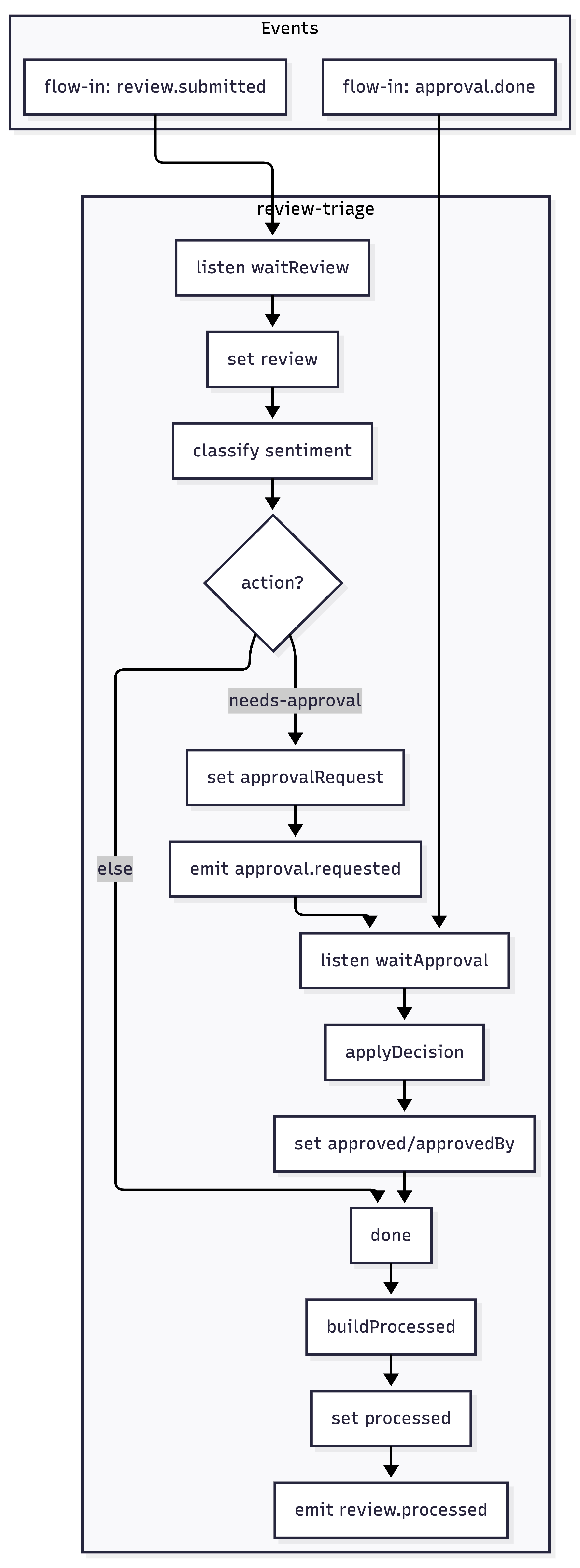The approval endpoint sends approval.done back to flow-in with correlation metadata so the engine can resume the correct instance. Finally, the workflow emits review.processed on flow-out so downstream systems can react.