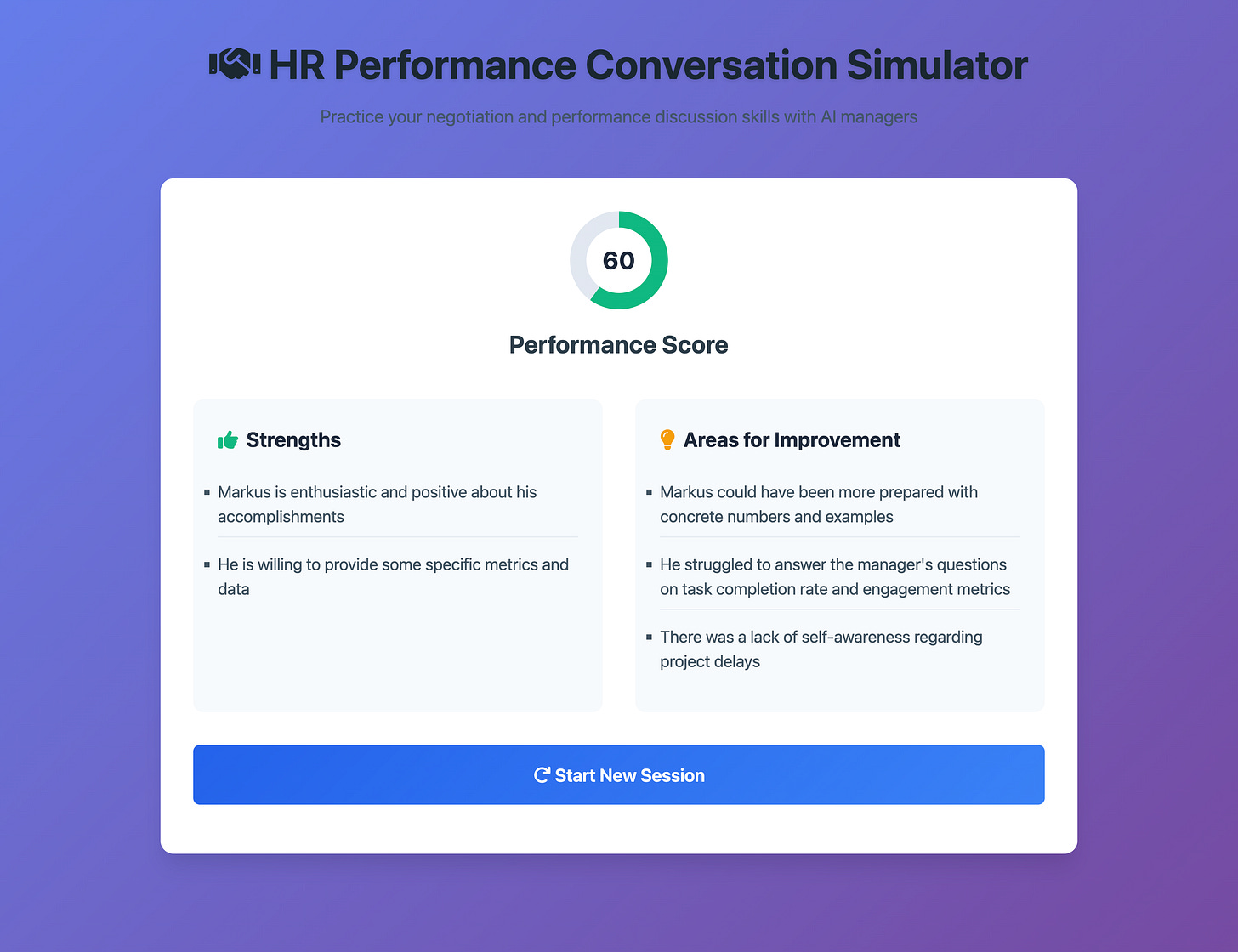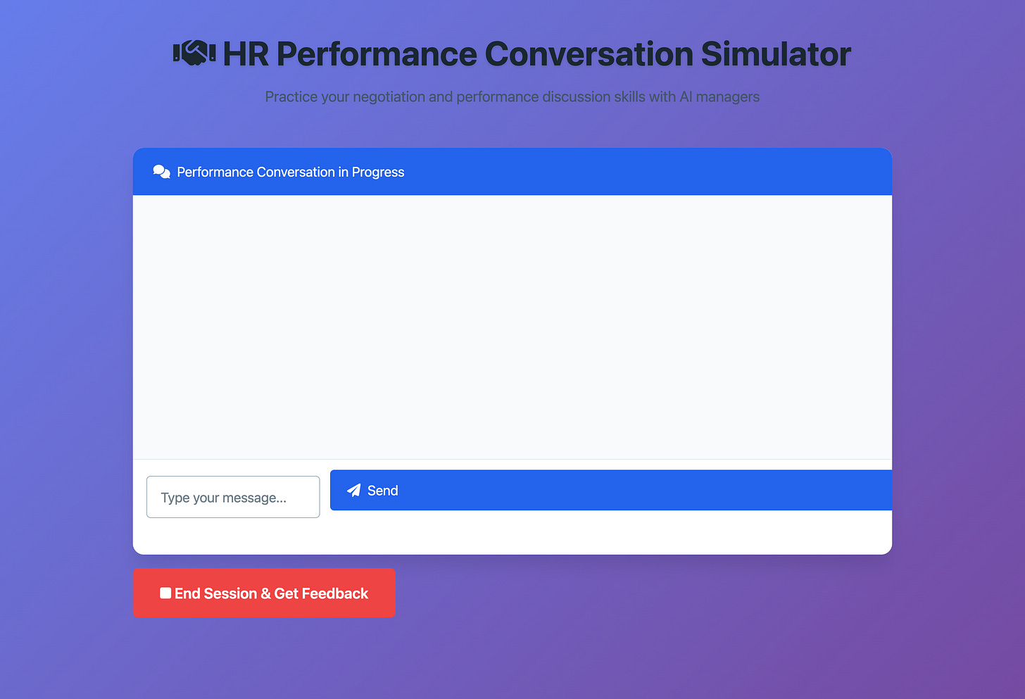 Open http://localhost:8080 to try out the simulator. You can now interact with different manager personalities and scenarios, and receive AI-generated negotiation feedback.