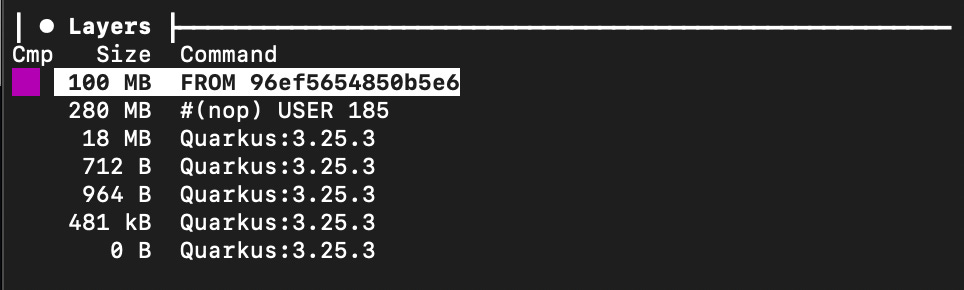 dive your-docker-username/quarkus-jib-demo:1.0In the dive UI, you can navigate the layers on the left panel and see the contents of each layer in the right panel. You will clearly see the distinct layers Jib created.