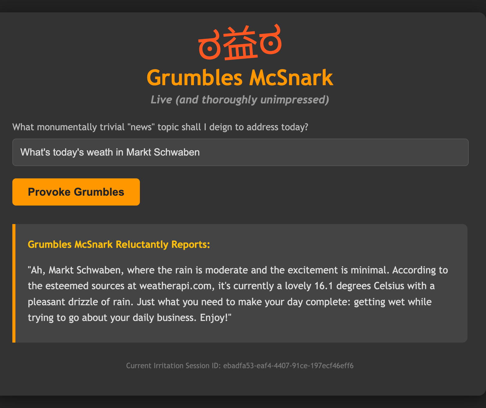 Alright, prepare your coding fingers and your best cynical smirk! We're about to embark on a hilarious journey to build "Grumbles McSnark," your very own local AI news anchor who's perpetually unimpressed, armed with the internet, and now, gracing us with his presence on a "glamorous" web page.