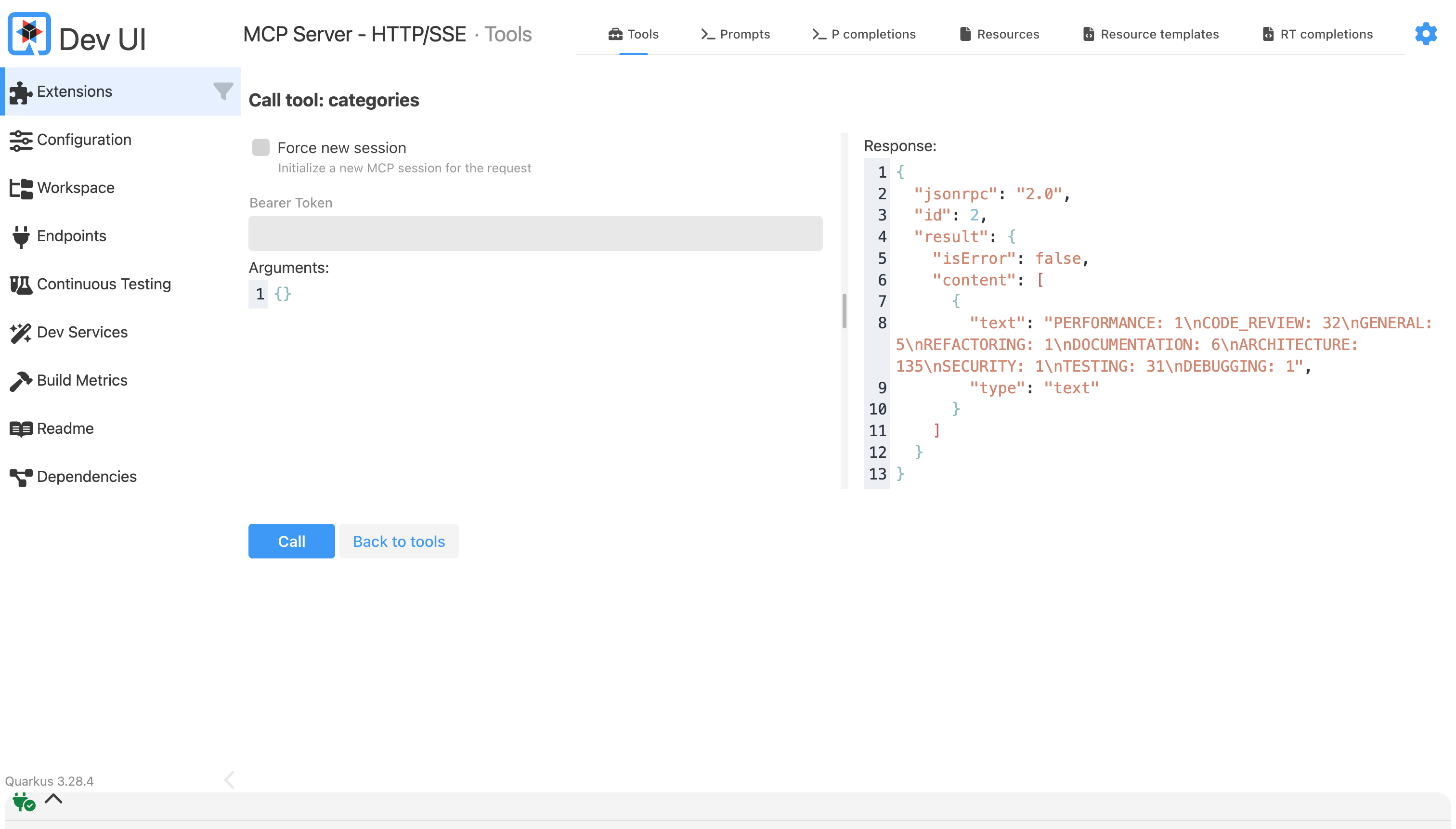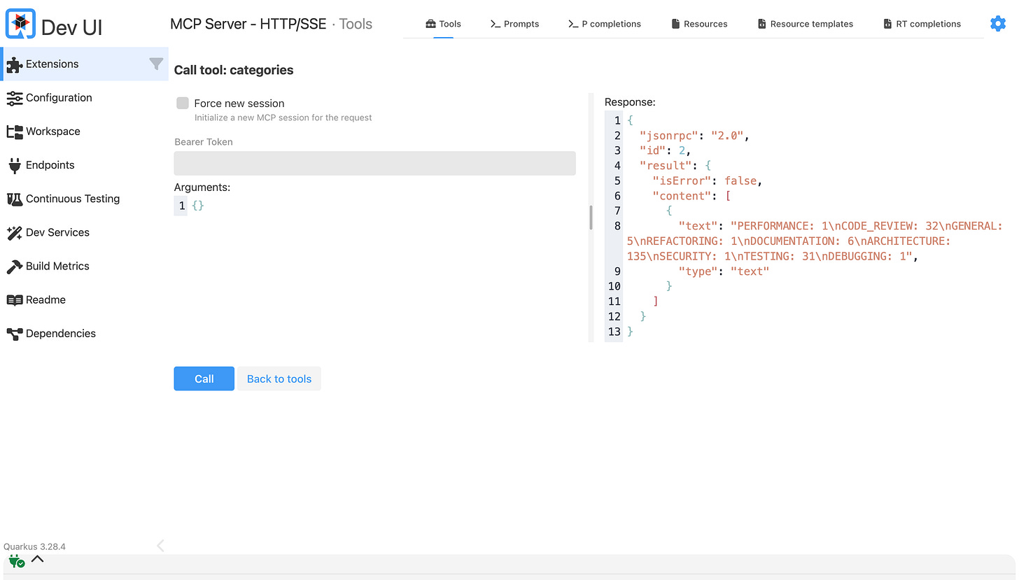 Open http://localhost:8080/q/dev → the MCP Server card lists all resources, tools, and prompts.
