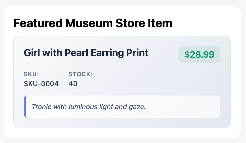 This adds a tiny online shop to our existing museum application. It sells gift-shop items tied to artworks. You’ll build clean REST endpoints with JSON, a minimal and a modern MCP server that streams inventory for a given artwork over HTTP/SSE. It’s small enough to read in one sitting and complete in an afternoon. It’s also production-minded: pinned versions, dev-friendly defaults, and clear extension points.