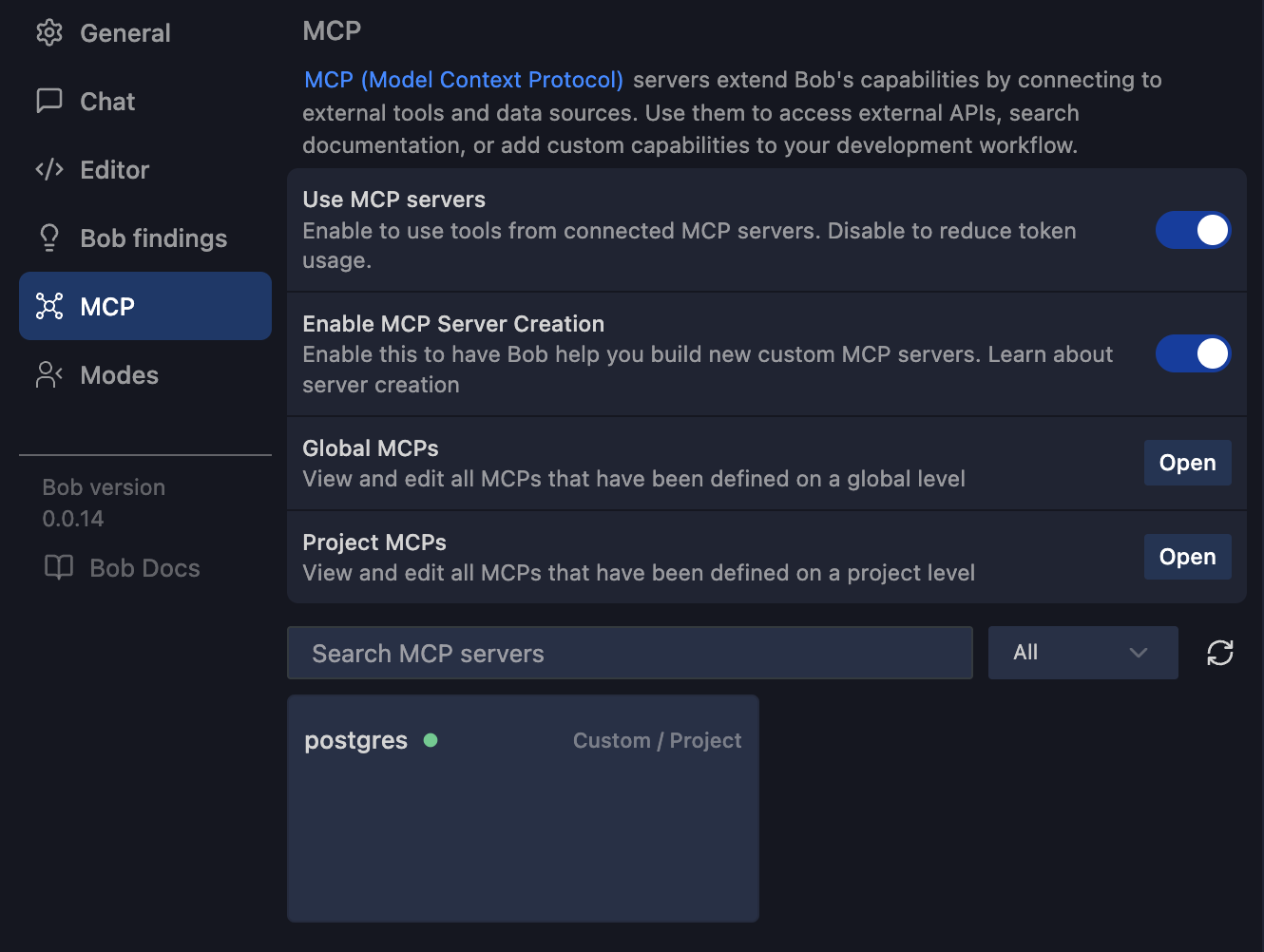 podman pull crystaldba/postgres-mcpWe connect a PostgreSQL MCP server to the database and let IBM Bob ask questions on our behalf. Open Bob and navigate to the MCP Server Settings. Add a Project MCP: