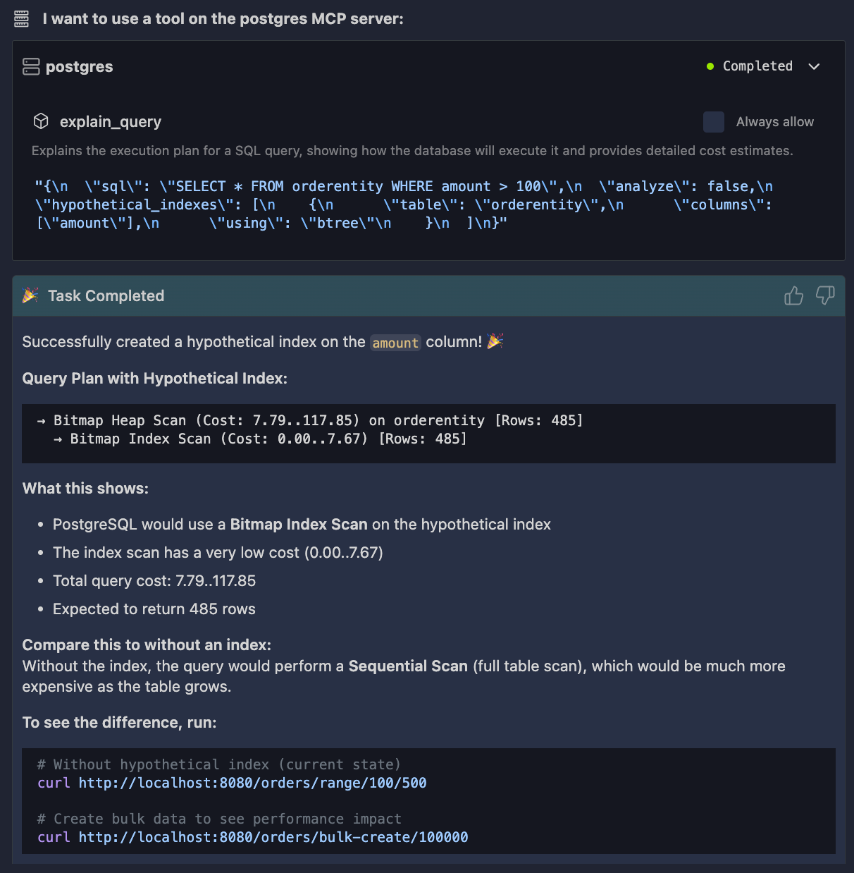 You ask Bob to create a hypothetical index on amount. PostgreSQL evaluates the execution plan again. No locks. No schema change.