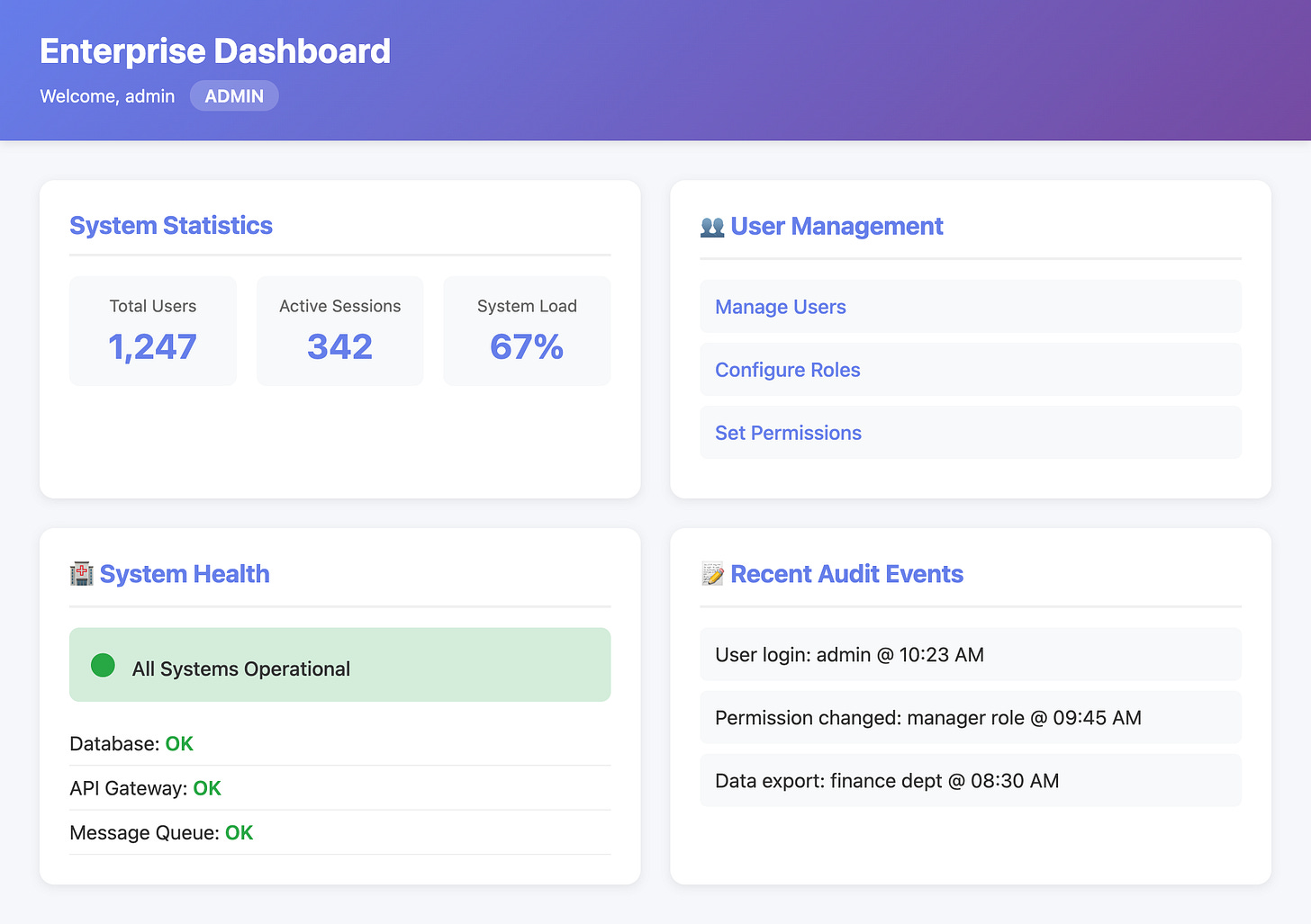 <div class=”stat”><span class=”label”>Total Users</span><span class=”value”>1,247</span></div>