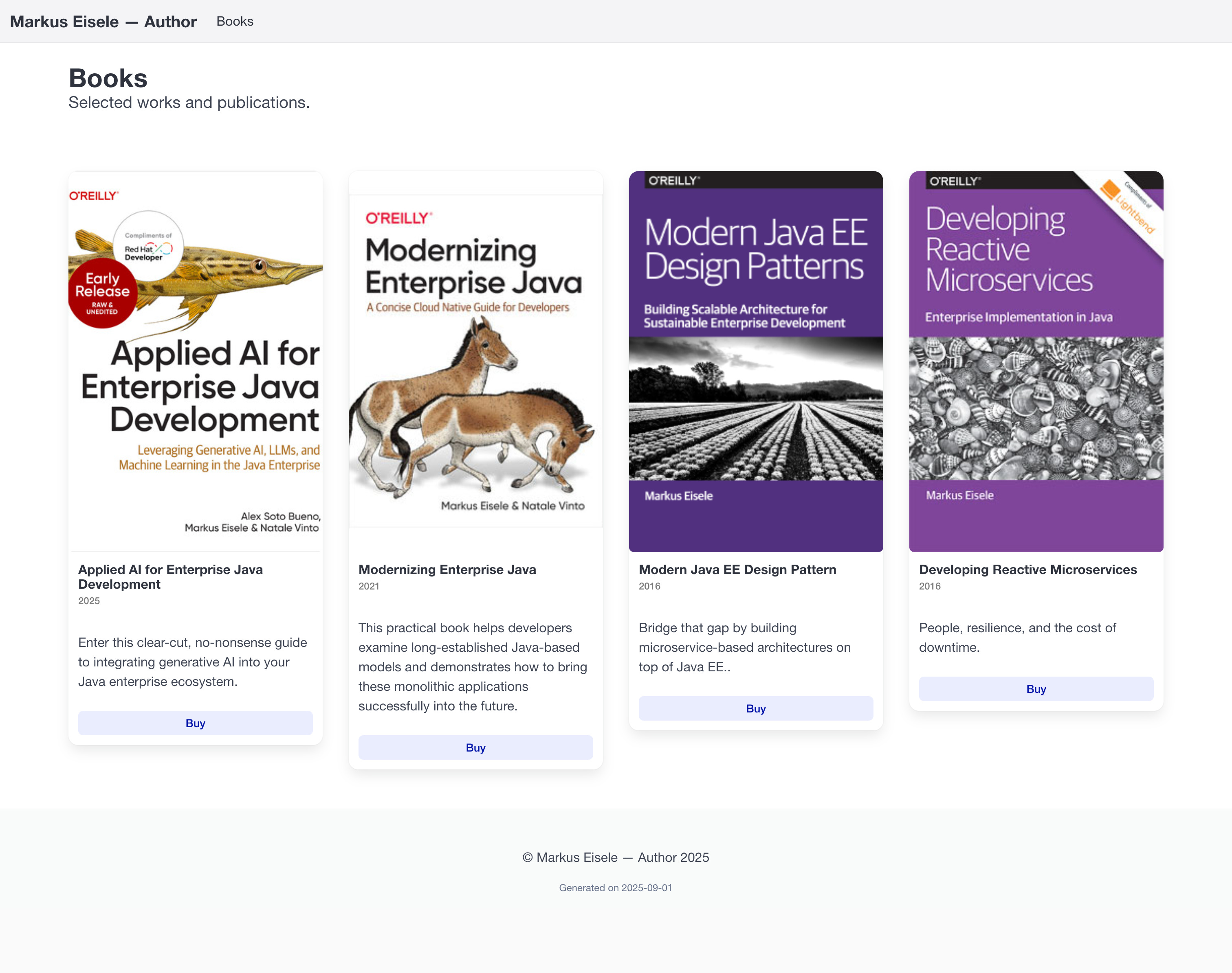 </div>For the homepage (index.html), that means a short author bio and a clean layout with an image. For the books page (books.html), the real work is looping over the YAML data we defined earlier and rendering each book as a Bulma card. Thanks to Qute, the templates stay readable. Loops, conditions, and variable expressions blend naturally into the HTML without breaking its structure.