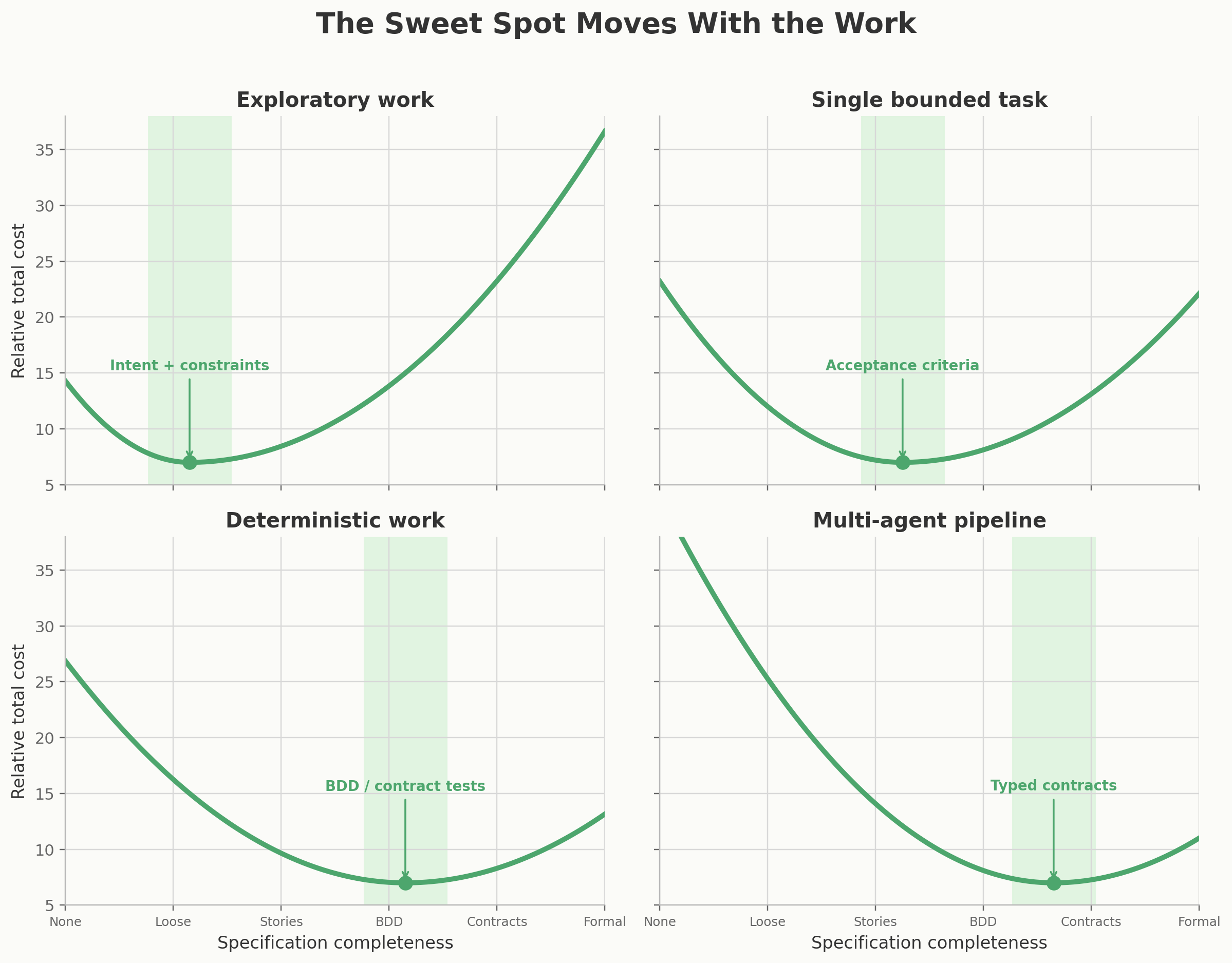 The total cost of both approaches traces a U-shaped curve when you plot it against specification completeness. The minimum of that curve — the sweet spot — sits somewhere around well-structured acceptance criteria or BDD scenarios. Not at zero specification, and not at a 40-page formal requirements document.