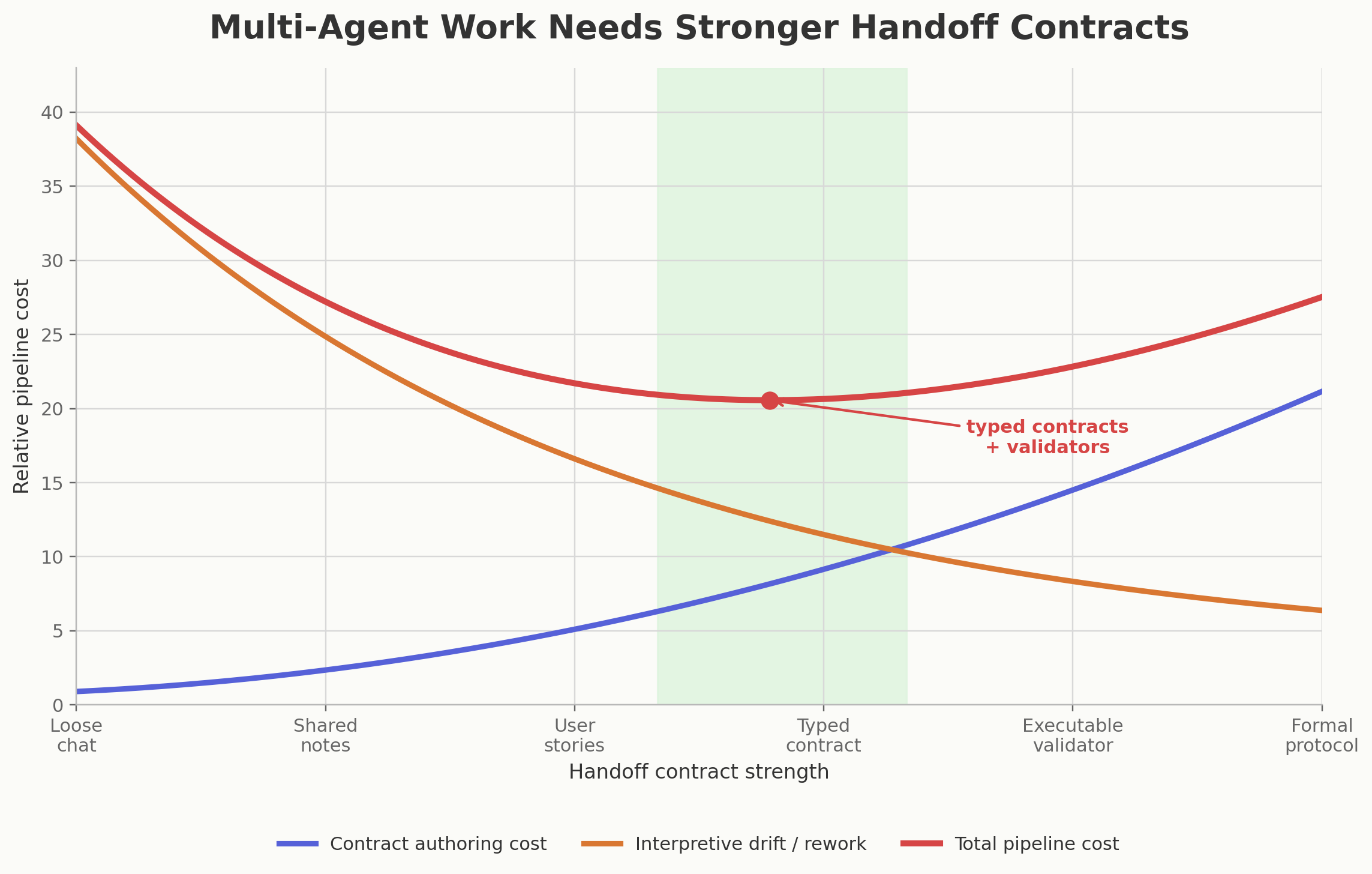 For multi-agent work, the x-axis is no longer just “how much did we specify?” It is “how strong is the handoff contract?” The minimum moves toward typed contracts and executable validators.