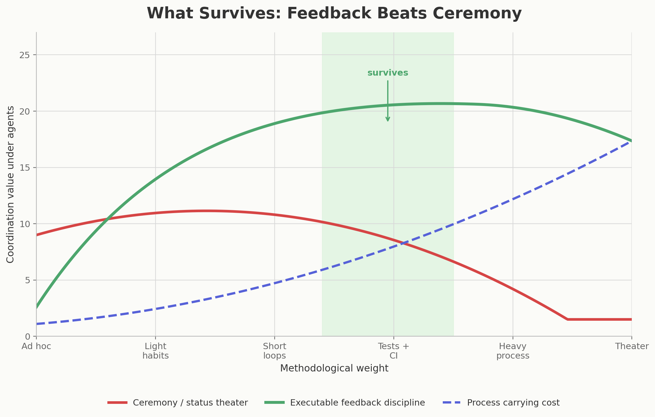 What probably fades is methodology as coordination theater for large groups of humans. What survives is methodology as a set of constraints that make ambiguity cheaper to discover.