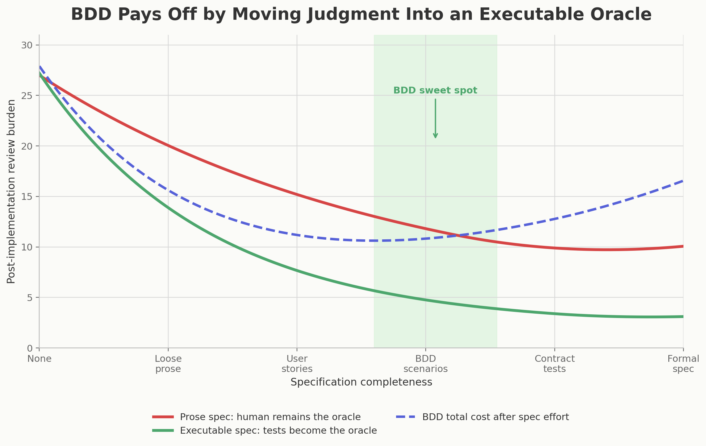 At the other extreme: full formal specification. TDD, BDD, Gherkin scenarios, acceptance criteria locked down before a single line of code runs. The upfront human effort is real and visible. But the downstream verification cost looks fundamentally different, because the tests are the oracle. Pass or fail. The human doesn’t need to personally evaluate every output — the spec does it automatically, repeatedly, without fatigue.