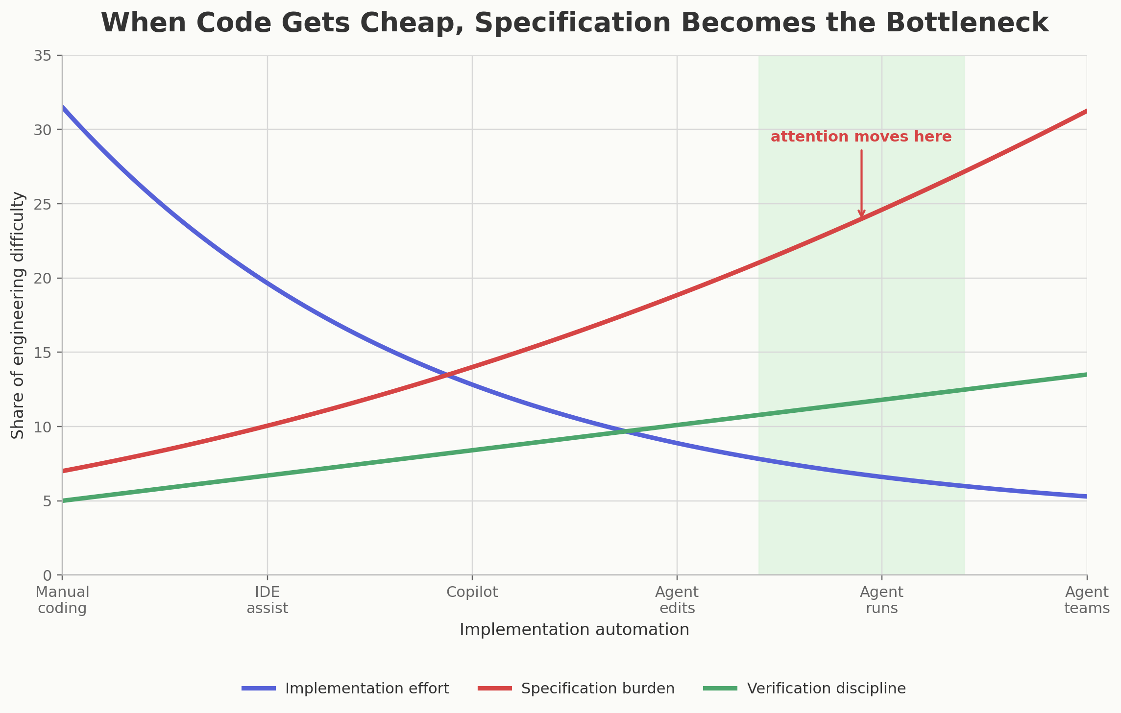 When implementation gets cheaper, the bottleneck does not disappear. It moves into specification and verification.