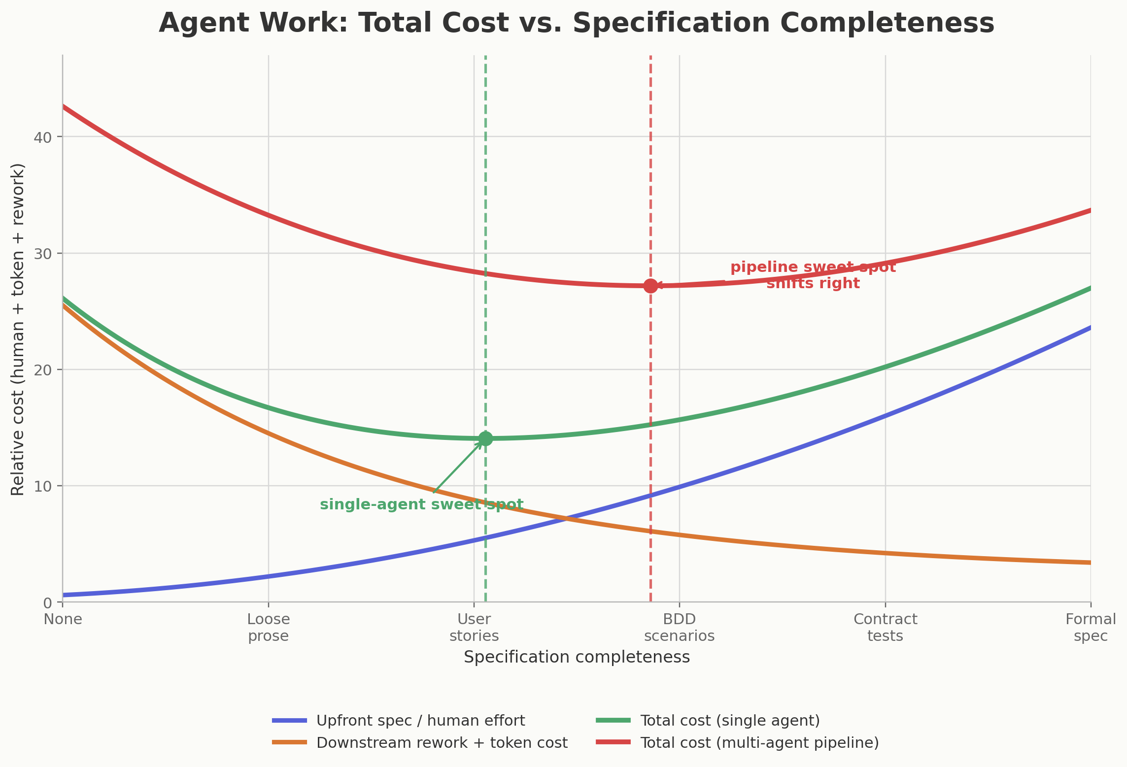 At one extreme: minimal specification. You describe intent loosely, agents interpret freely, and work begins immediately. The upfront cost in human effort is near zero. What you don’t immediately see is what accumulates downstream: correction loops, each carrying token cost plus human re-engagement time. Review cycles where a human acts as the oracle for every output — deciding whether what the agent produced is what was actually meant. Rework when it wasn’t.