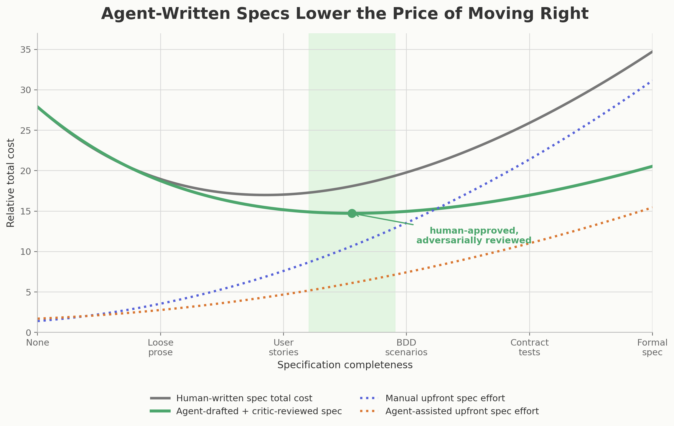 Agents do not remove the need for a spec. They can lower the cost of moving toward the useful part of the curve, where the spec is complete enough to guide implementation but still reviewed by a human.