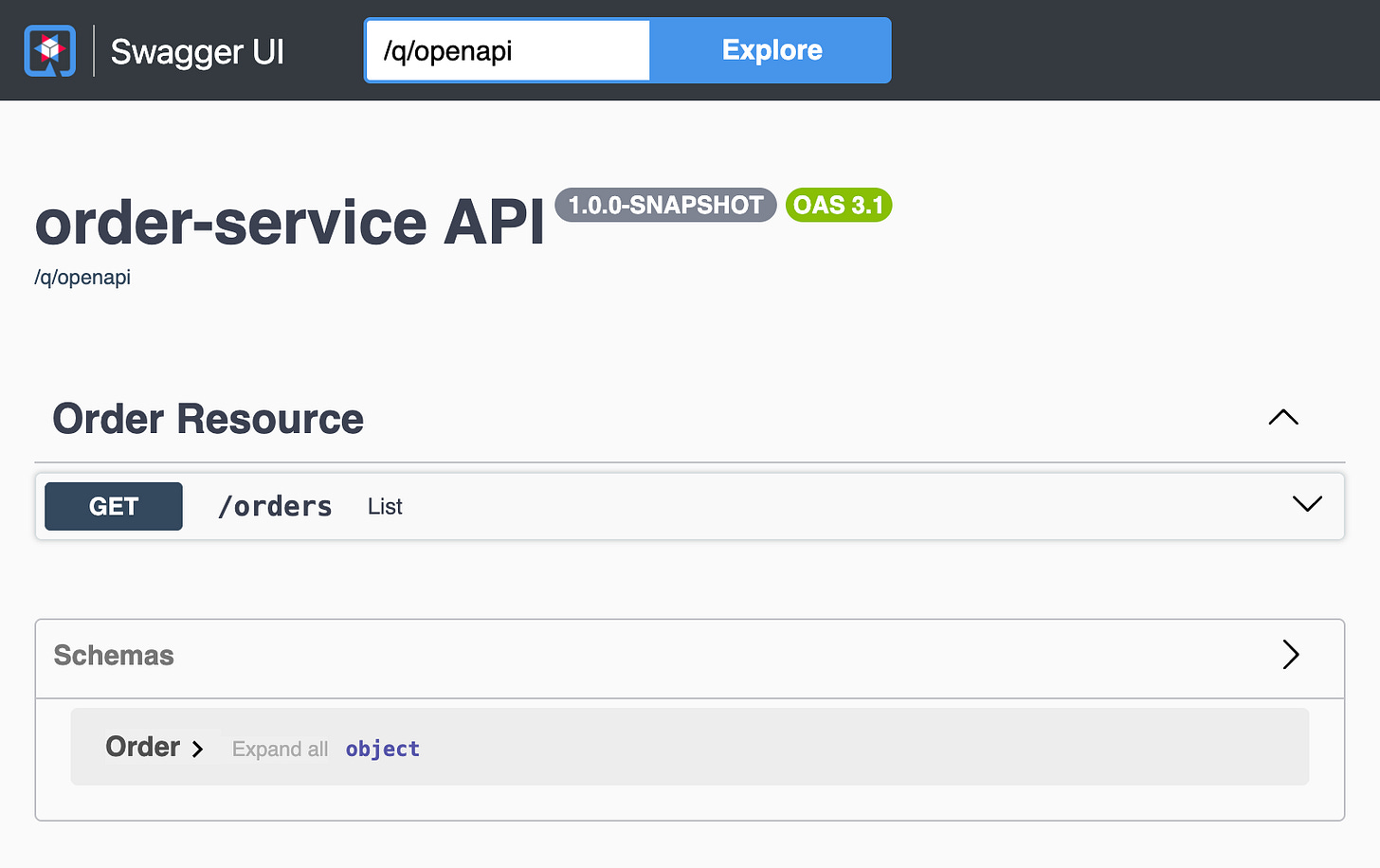 version: 1.0.0-SNAPSHOTThe response includes the /orders path, the GET operation, the schema for Order, and the correct response metadata. There is no discrepancy between what runs and what is documented because both are produced from the same source.