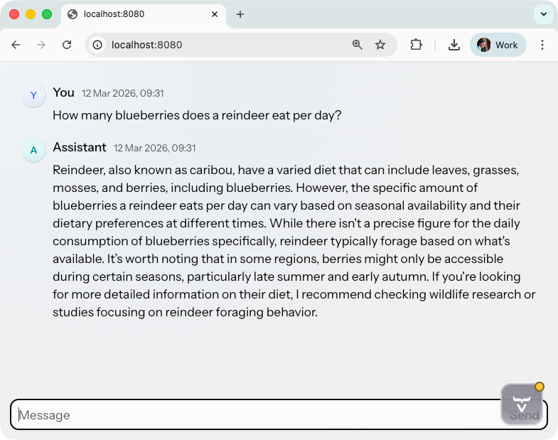 With the application running, open http://localhost:8080. Type a question into the input field and submit it. You should see your message appear immediately in the MessageList, followed by the assistant’s response arriving token by token. The view scrolls automatically to keep the latest content visible.