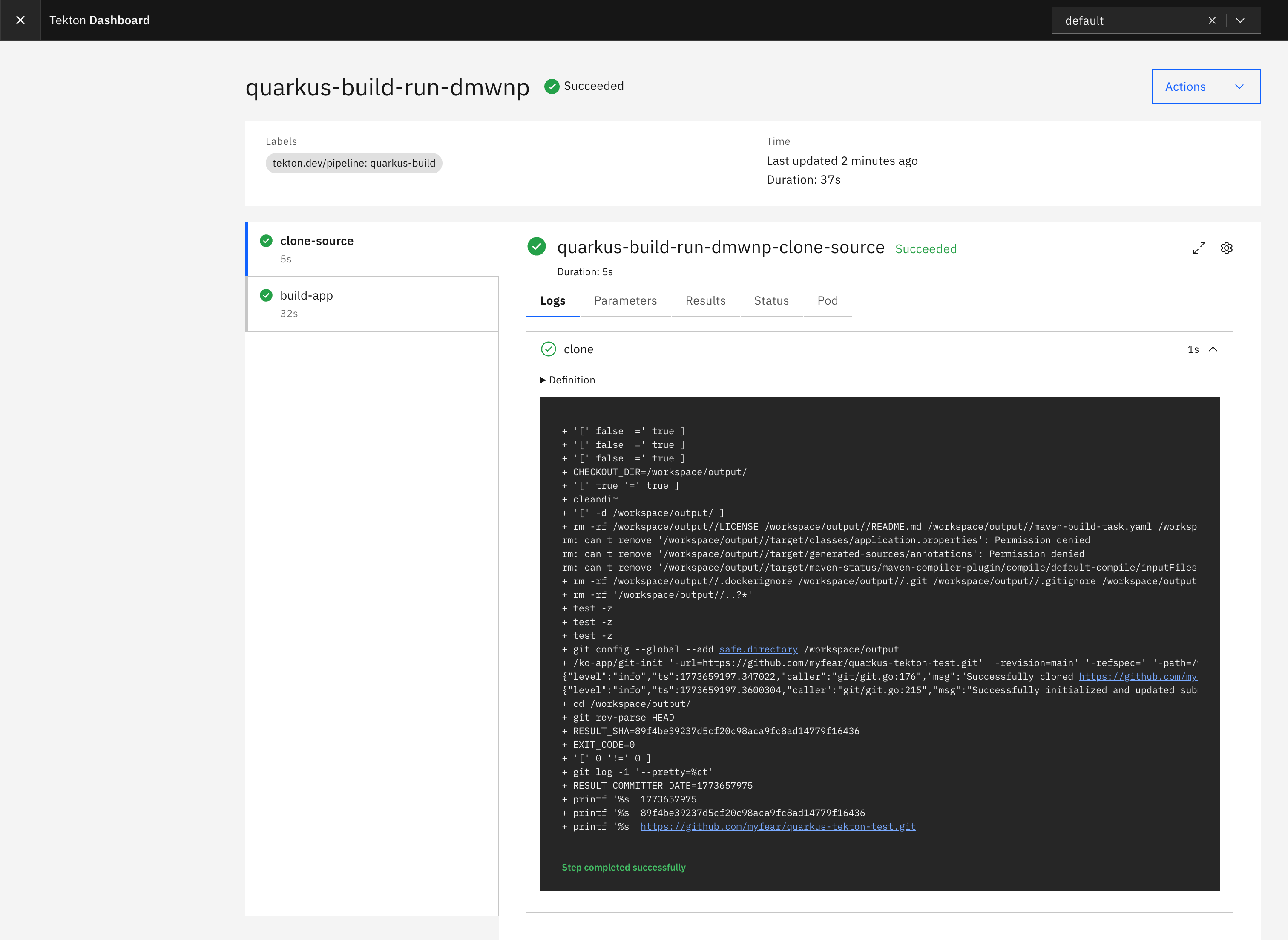 kubectl replace -f quarkus-build-pipeline.yamlVerify all three params are present: