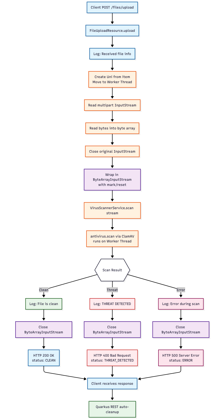 Implements fail-safe security where files are rejected on any scanning failure, with explicit HTTP status codes (200=clean, 400=threat, 500=error) and structured JSON responses
